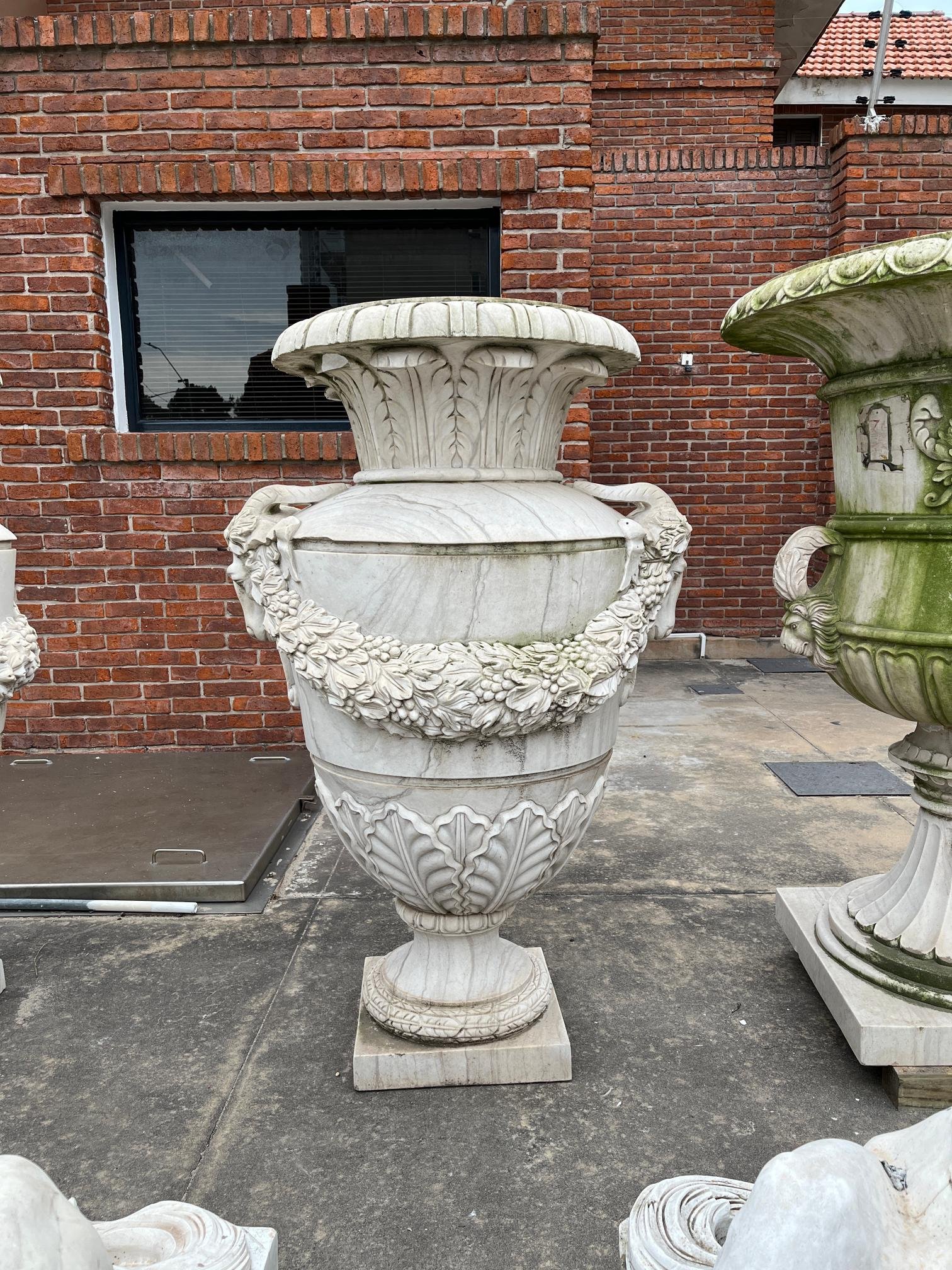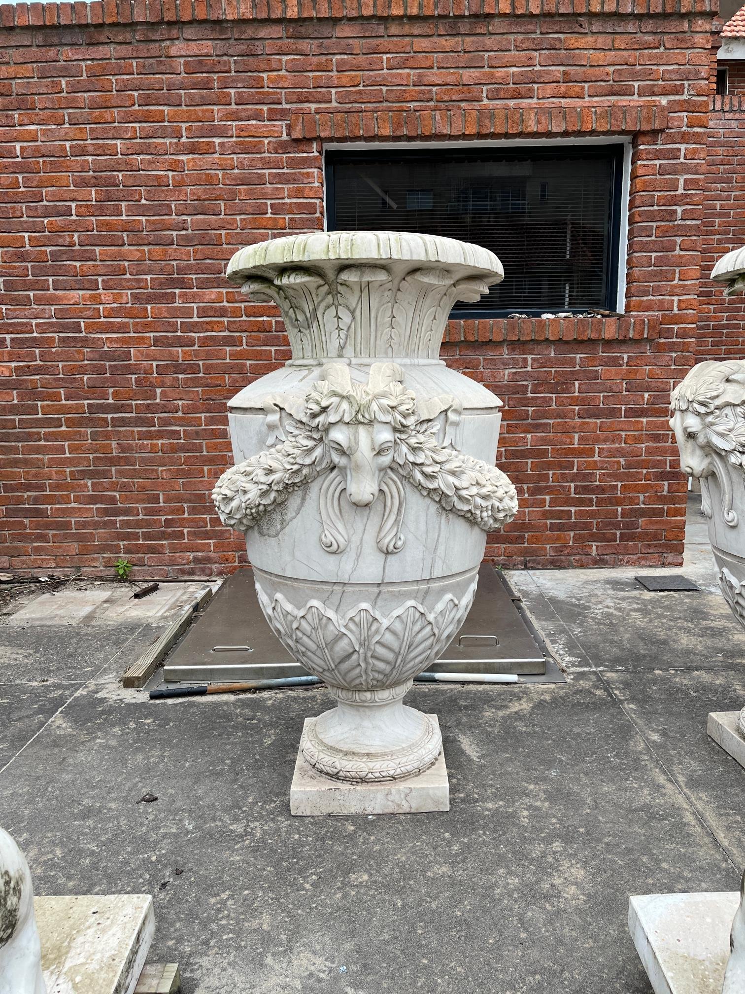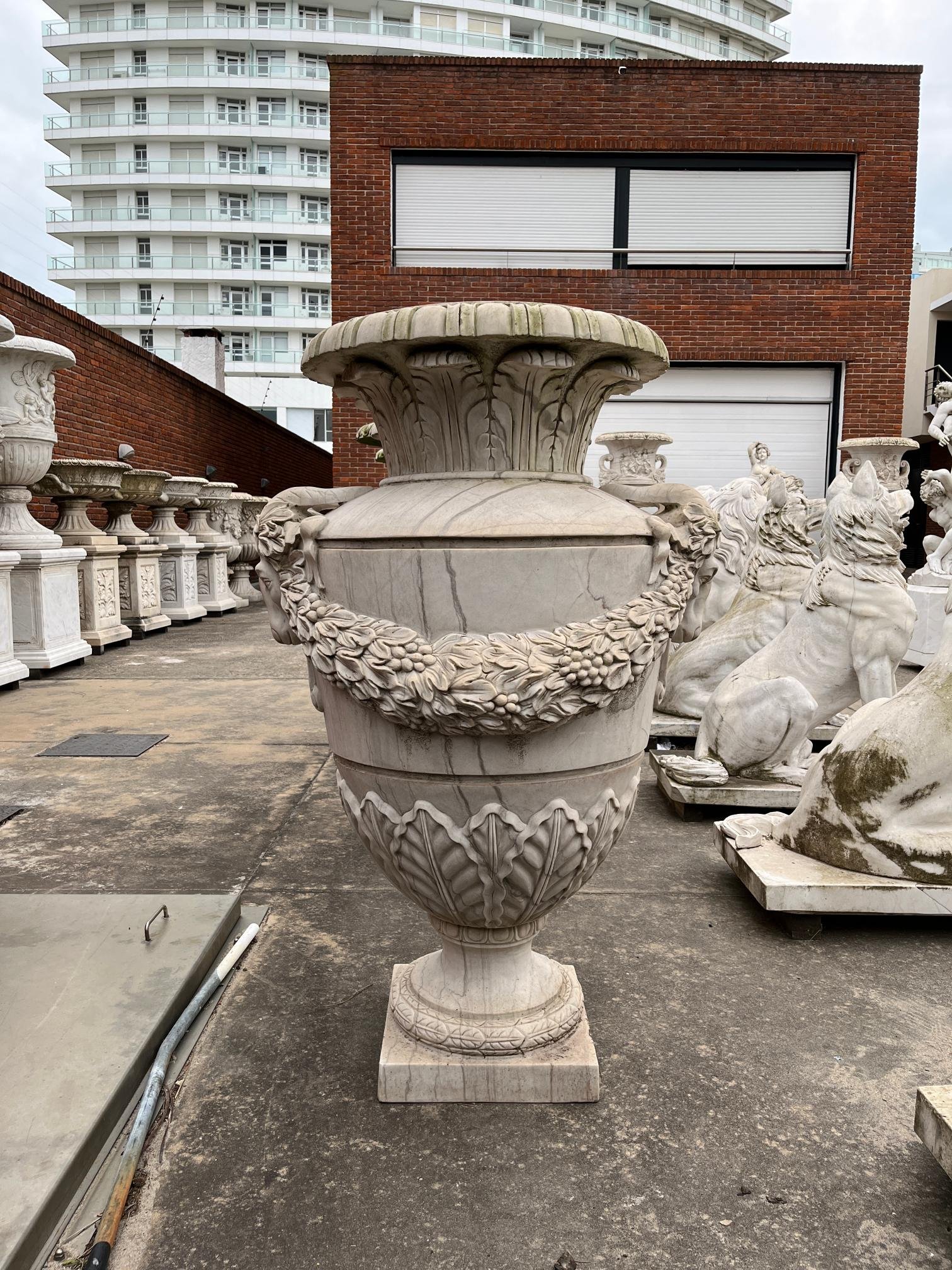 Par de copones en mármol blanco veteado estilo Luis XVI y esculturados «carneros y guirnaldas» con guardas de hojas de acanto. Alto 142. Diámetro 90 cm.