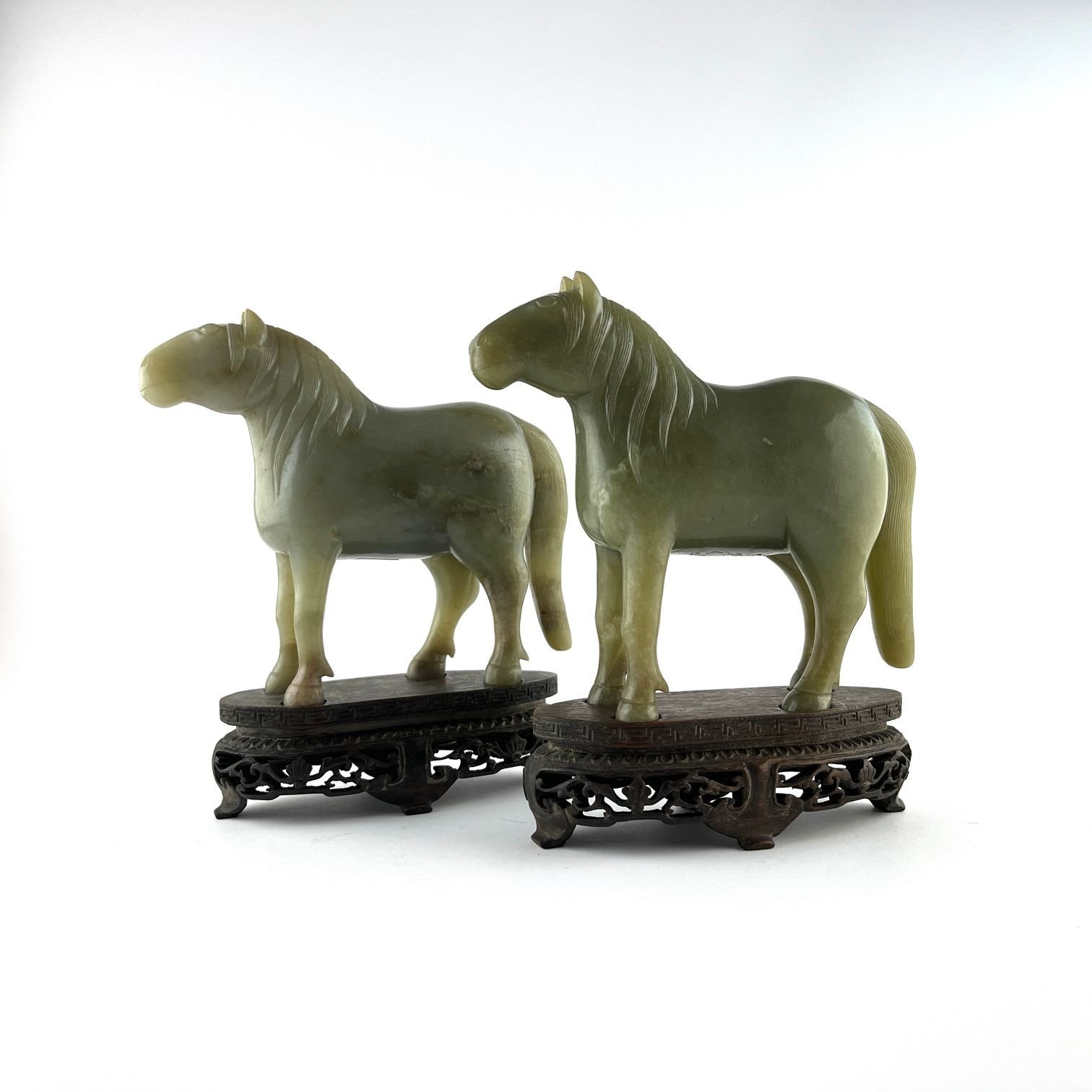 Par de esculturas chinas en jade. «Caballos.» 13 x 14 x 4.5 cm. Presentadas sobre penas en madera tallada y calada. Alto total 16 cm.