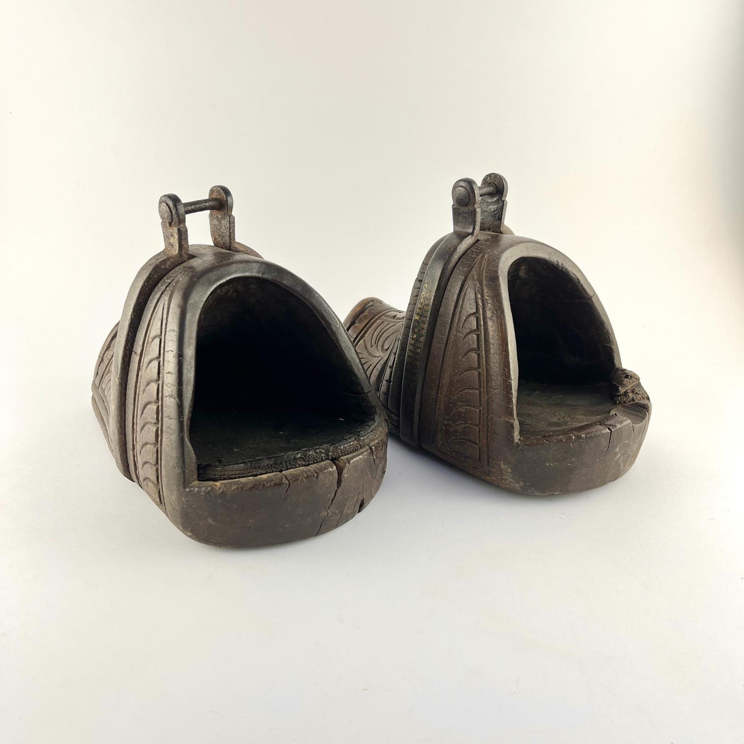 Par de estribos andinos tipo trompa de chancho, s. XIX, en madera tallada “hojas”, con arco en hierro forjado con decoración geométrica en alpaca.