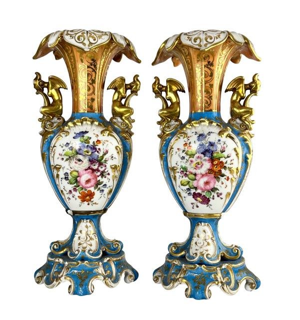 Par de floreros isabelinos en porcelana Buen Retiro decorados «escenas galantes» con detalles en dorado. Borde en ondas, con avería. Alto 41 cm.