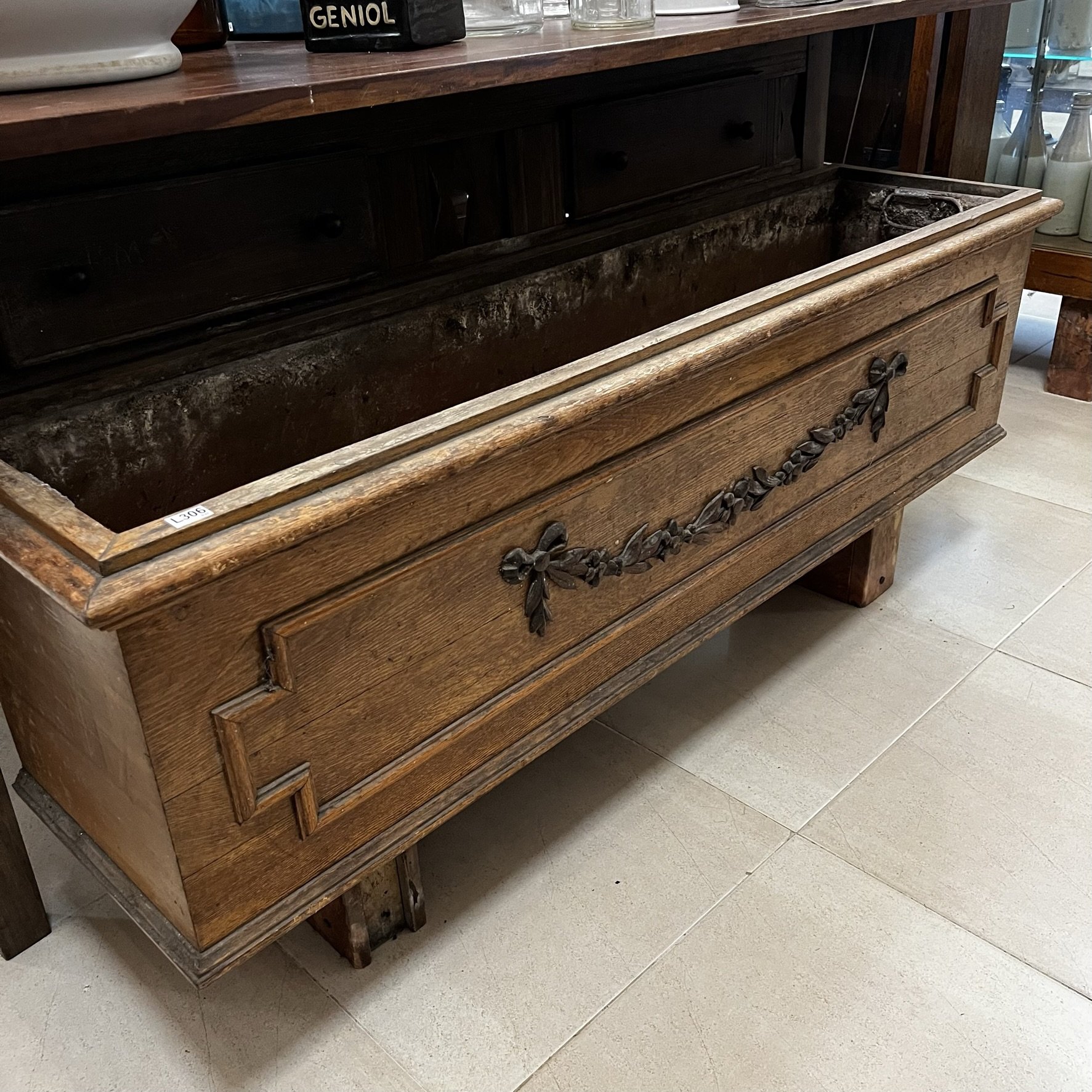 Par de jardineras en roble decorado «guirnalda». Interior con depósito en chapa. 54 x 131 x 35 cm.