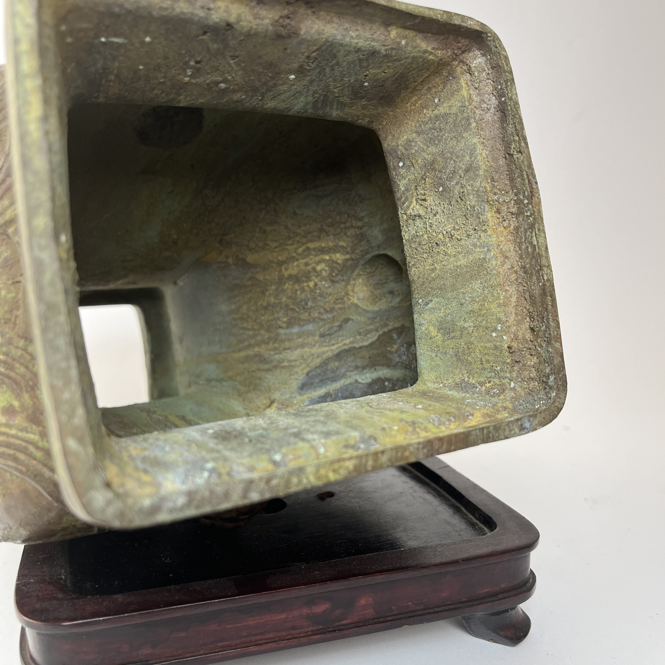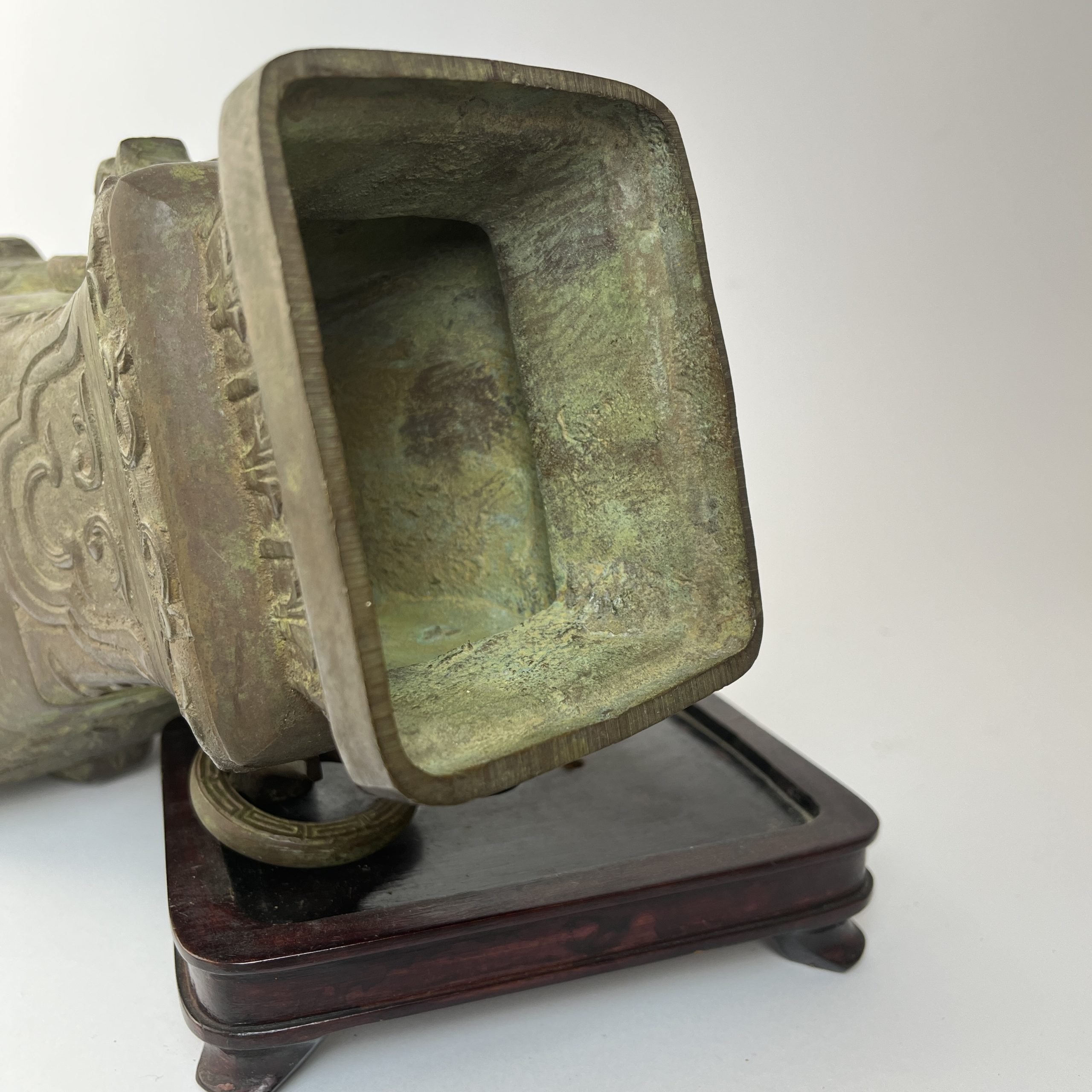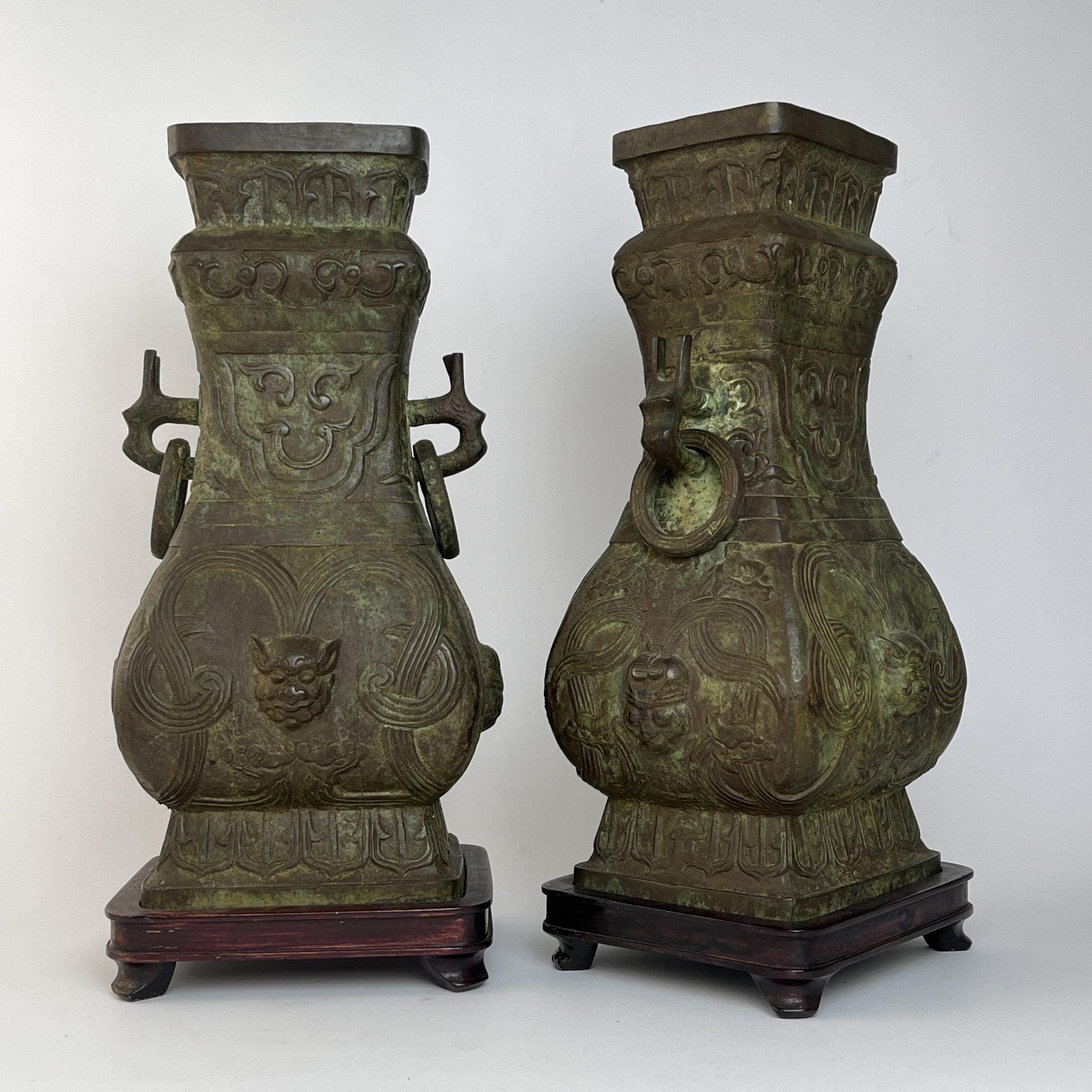 Par de jarrones chinos en hierro fundido, en forma hu, en el estilo del período Zhou Occidental (1040 a 771 a.C). 32 x 17 x 14 cm. Presentados sobre peanas en madera tallada. Alto total 35 cm.