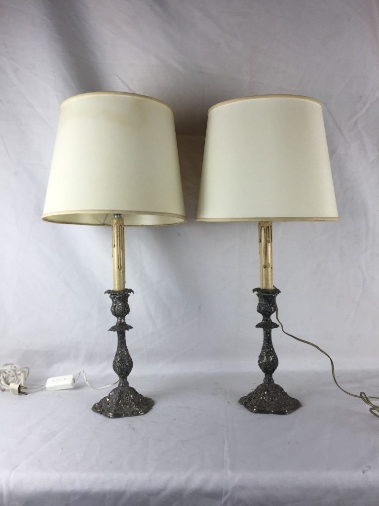 Par de lámparas realizadas con candeleros en metal plateado decorado «vides». Alto total 58 cm.