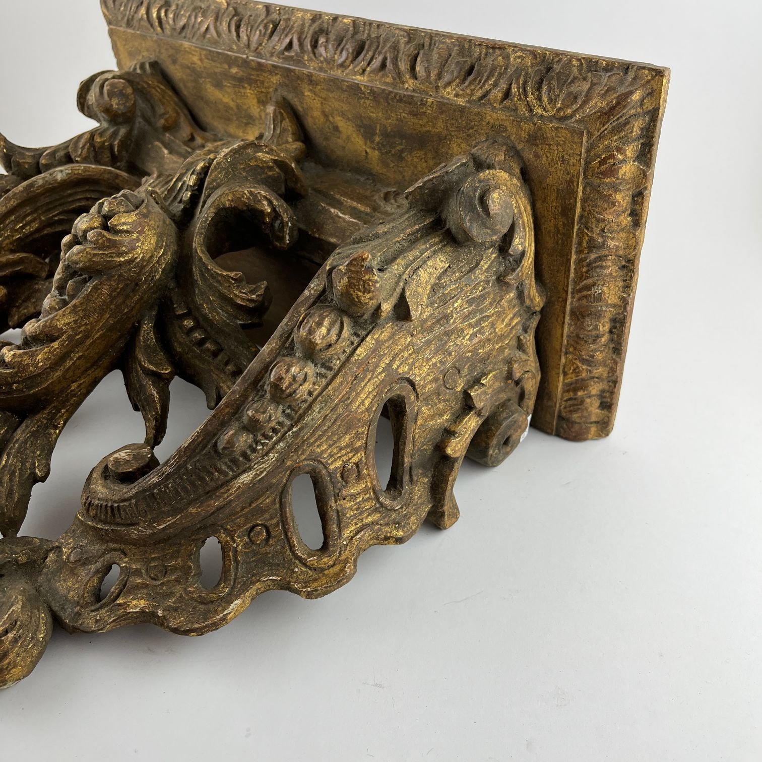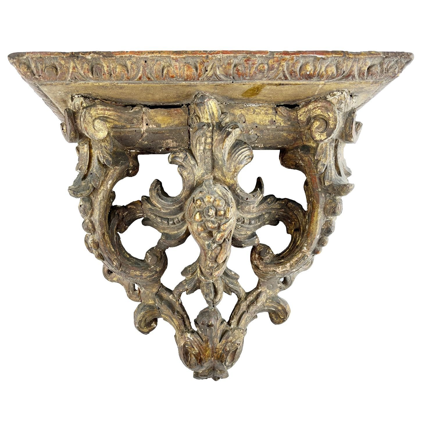 Par de ménsulas italianas en madera dorada sobre estuco, calada y tallada «vides y hojas de acanto». 38 x 40 x 19 cm.