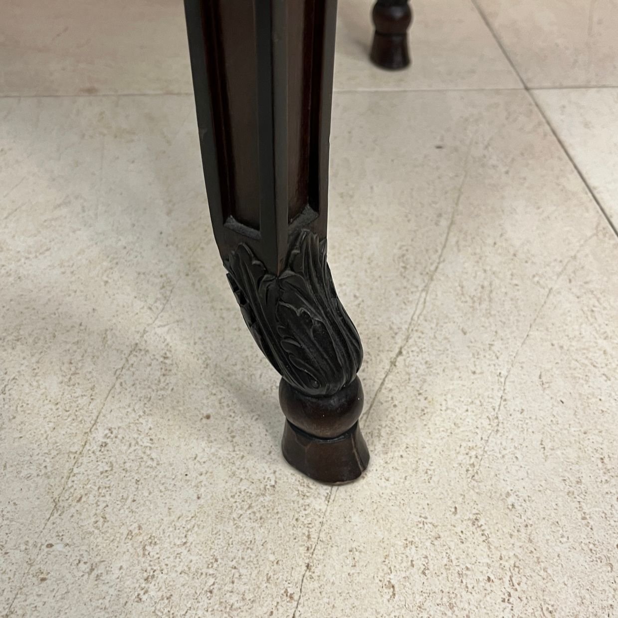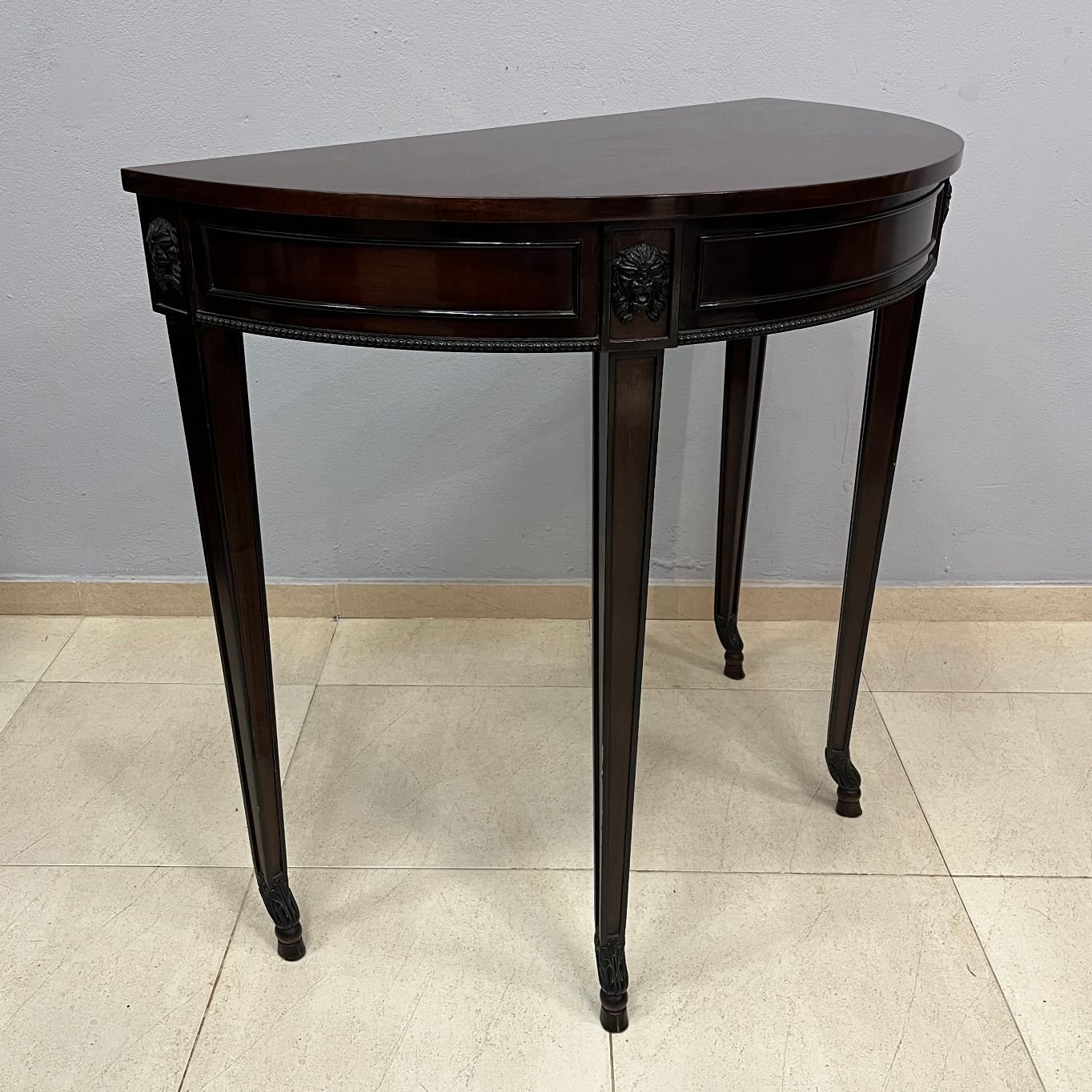 Par de mesas de arrimo inglesas en madera de caoba, medio punto. Borde perlado, cuatro patas esculturadas «pata de cabra» y laterales esculturados «cabeza de león». 90 x 100 x 50 cm.