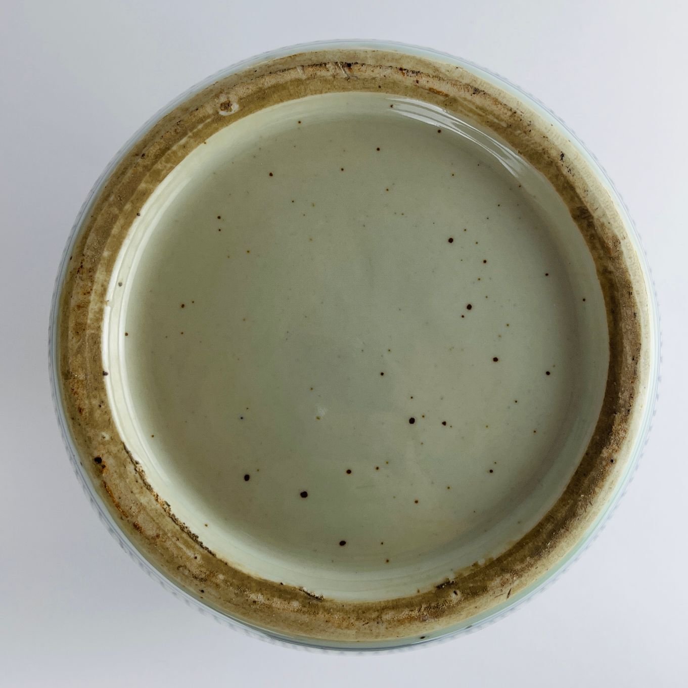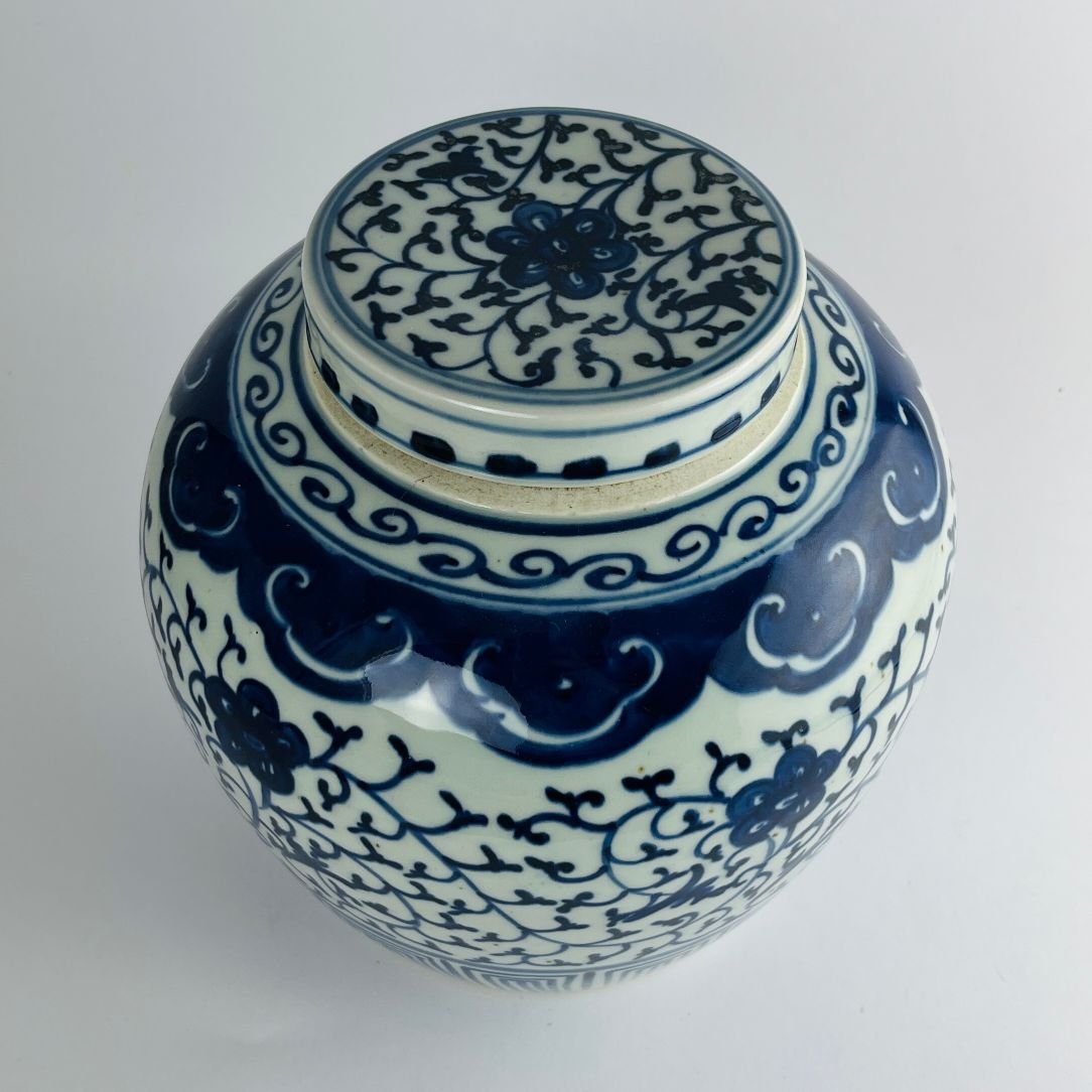 Par de potiches chinos en porcelana azul y blanca decorada «flores». 22 x 20 cm.