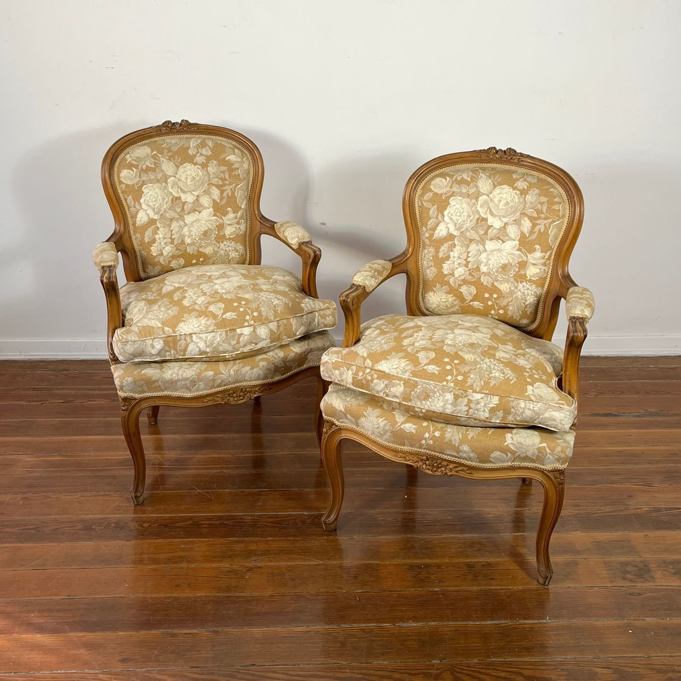 Par de sillones estilo Luis XV con asientos, respaldos y apoyabrazos tapizados «flores» en tonalidades marrones. Almohadones en pluma duvet.