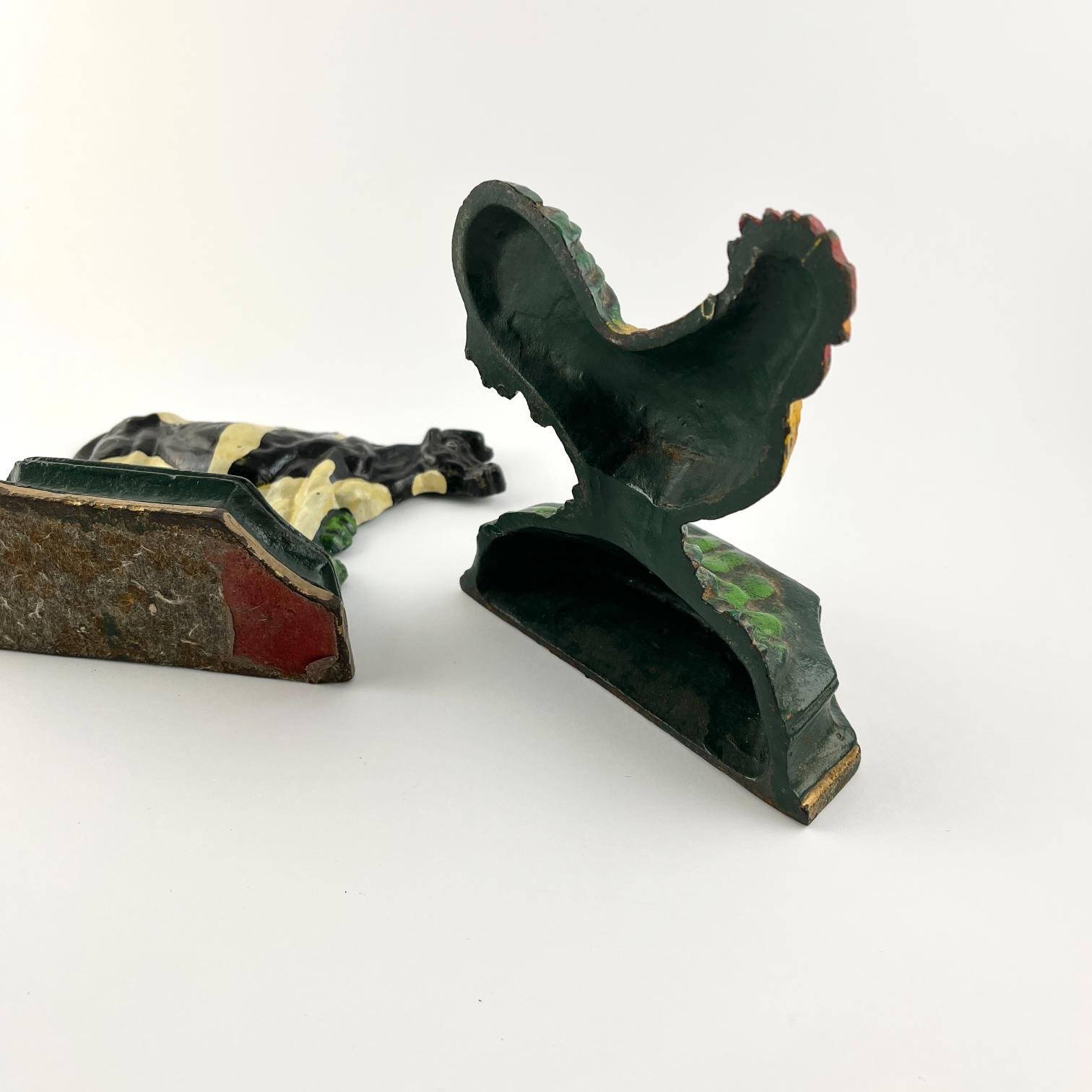 Par de sujetalibros en hierro fundido y policromado. «Animales de campo.» Alto 13,5 cm.