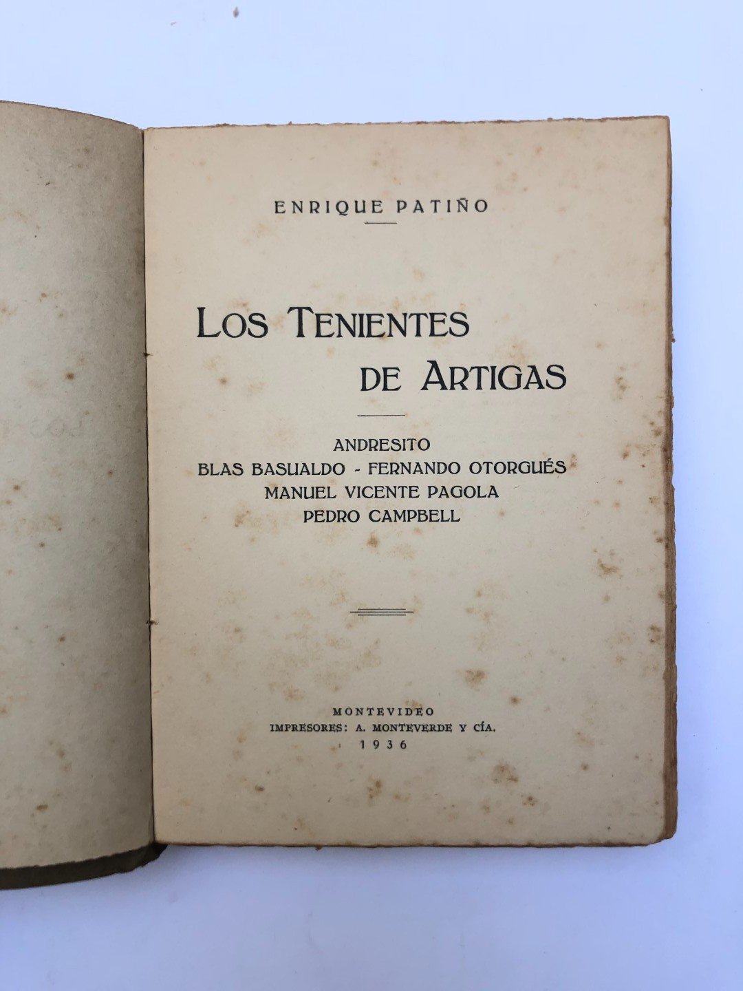 PATIÑO, Enrique: Los tenientes de Artigas (…). Montevideo, Impresores A. Monteverde & Cia. 1936. Encuadernación rústica del editor.