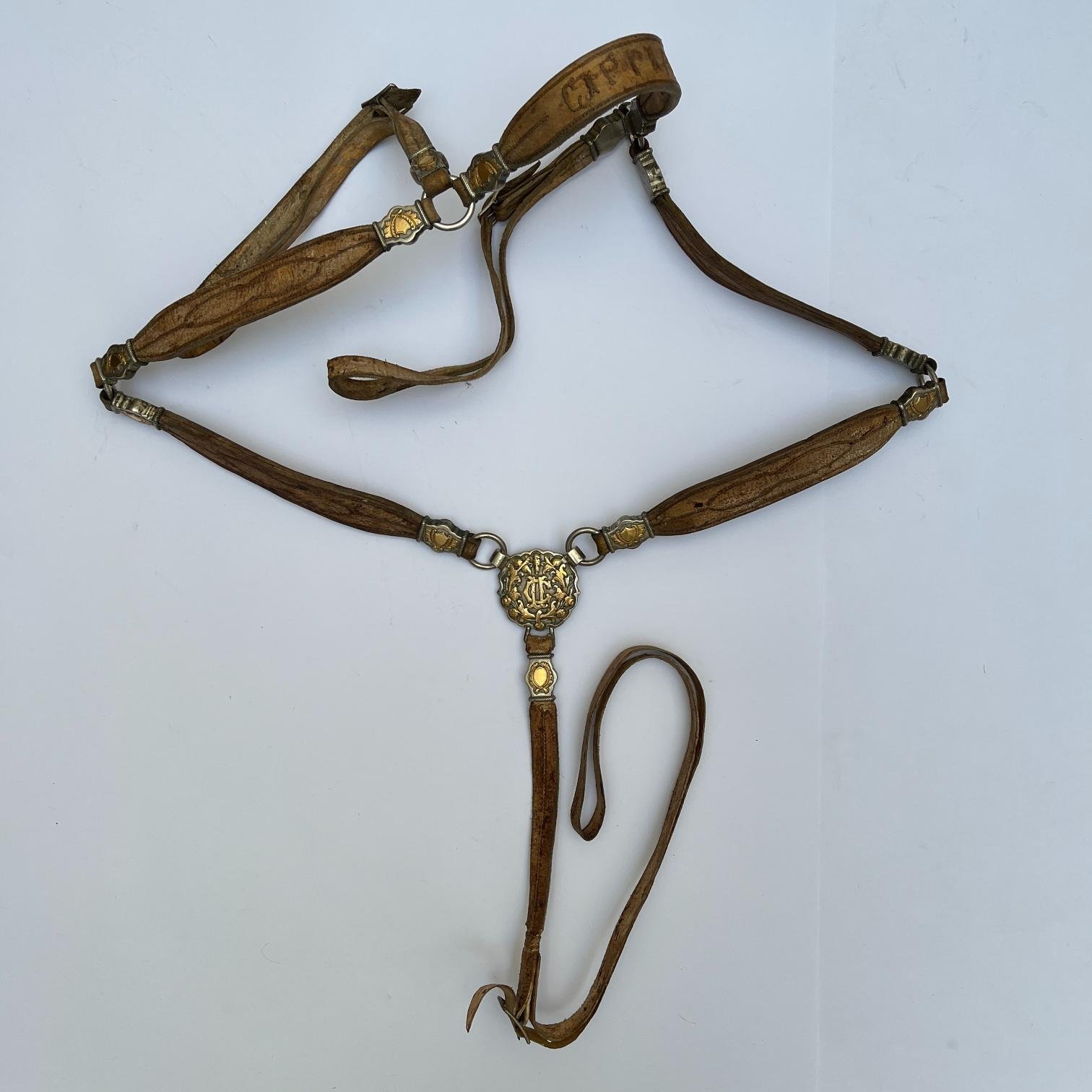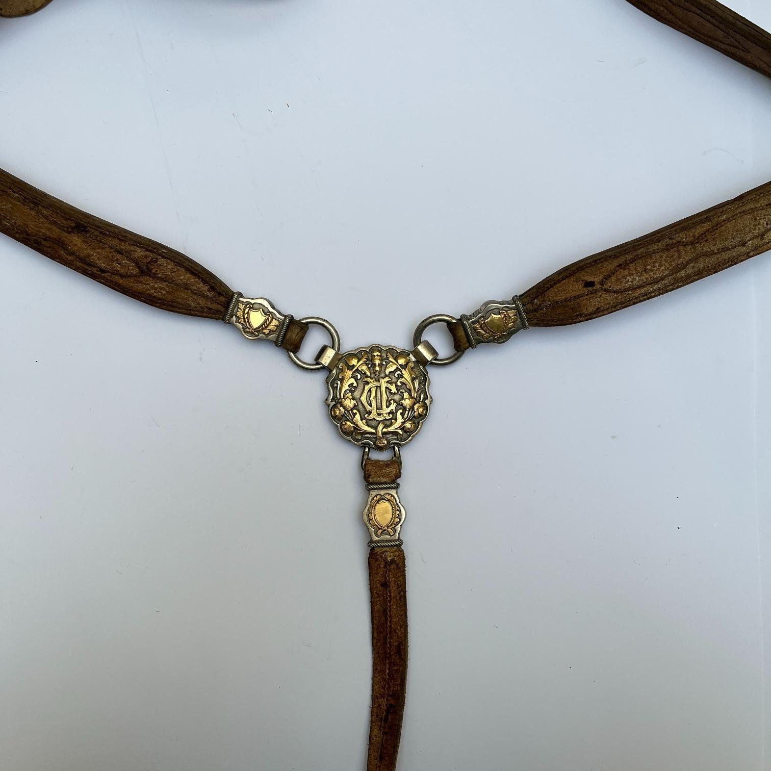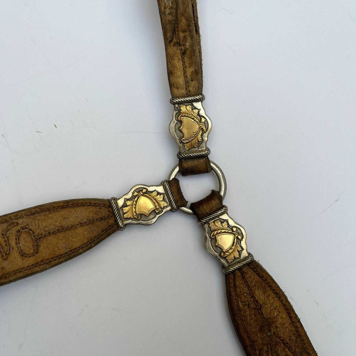 Pechera en cuero crudo decorado con fino cuero trenzado e inscripción «Cipriano». Medallón central en plata y oro cincelado «hojas y flores» con iniciales «C.U.» en oro. Trece pasadores en plata y oro cincelados «cartela» y seis argollas estriadas.