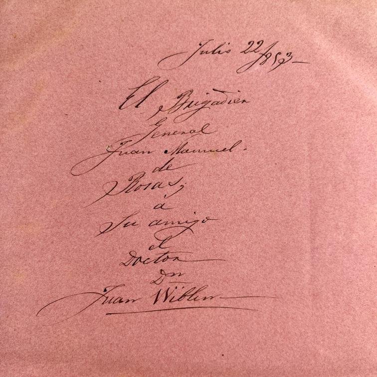 ¡Notable conjunto! Muy raros, en un singular conjunto, obsequio de Juan Manuel de Rosas, ya instalado en Southampton. Estamos sin lugar a dudas, ante el periódico más importante del gobierno federal en Argentina. Los 8 tomos ofrecidos llevan su encuadernación de época en pleno cuero marroquí rojo —el rojo punzó federal—, y con la dedicatoria del propio Brigadier General Juan Manuel de Rosas a su amigo Dr. Don Juan Wiblin escrita en tinta ferrogálica. Con pequeñas falencias los cuatro primeros volúmenes, no así los dos últimos que poseen deterioros de relevancia.