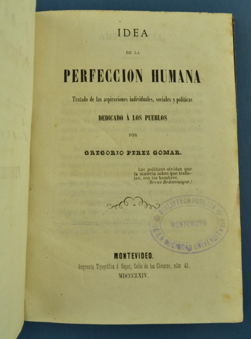 PÉREZ GOMAR, Gregorio: Idea de la perfección humana (…). Montevideo, Imprenta Tipográfica a Vapor. 1864. Encuadernación con lomo de cuero.