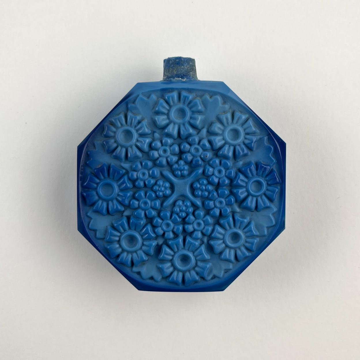 Perfumero octogonal art decó en pasta de vidrio azul y celeste decorada «desnudo femenino hojas y flores». Diámetro 6 cm. Falta tapa
