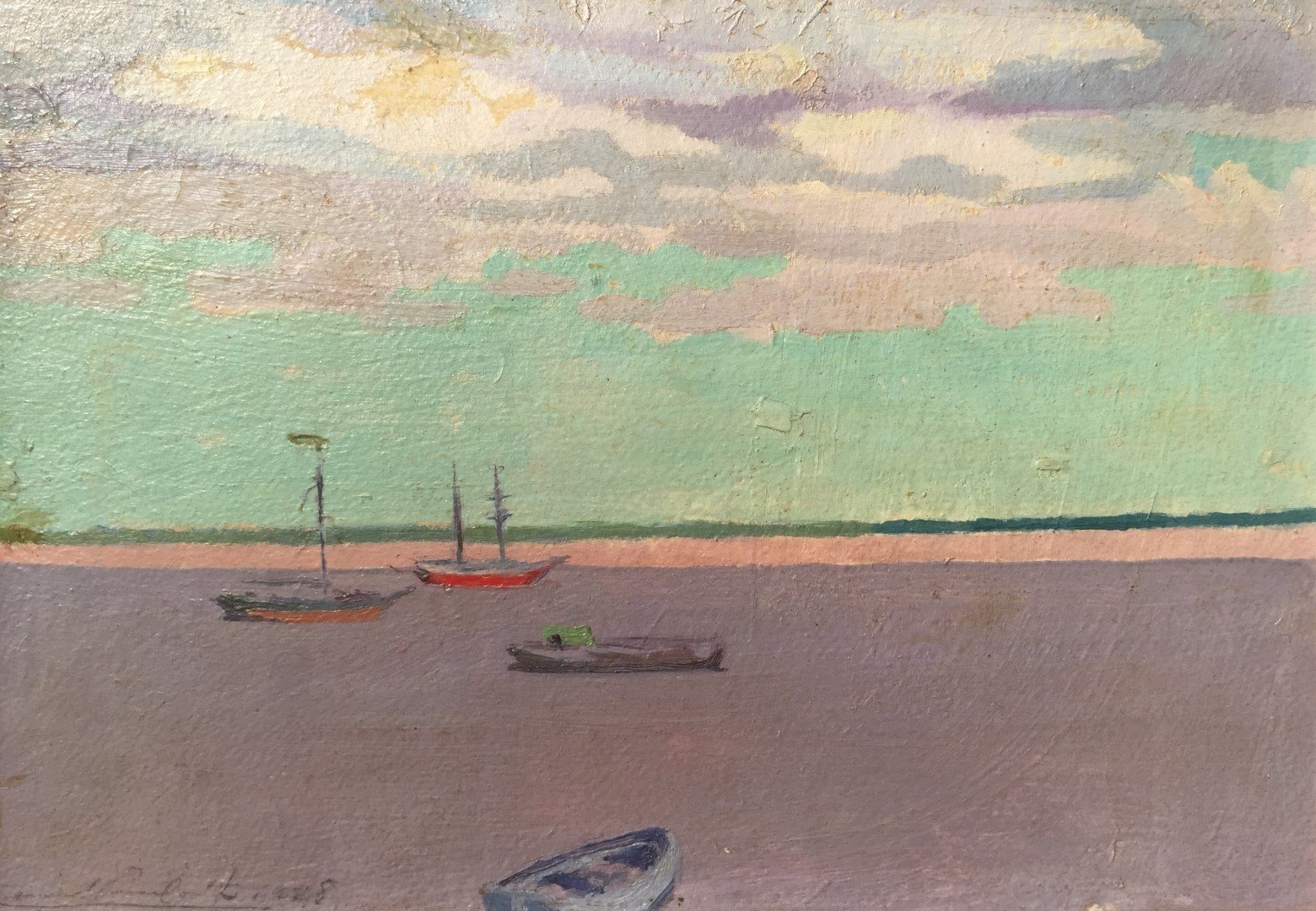 PESCE CASTRO, César (escuela uruguaya, 1890-1977). Óleo sobre cartón. “Marina.” Firmado y fechado “1929” abajo a la derecha. 25 x 35 cm.