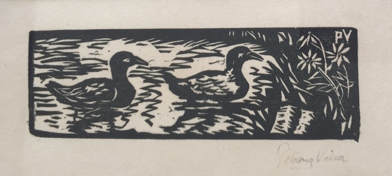 VIERA, Petrona (escuela uruguaya, 1865-1960). Grabado. «Patos.» 8 x 16.5 cm. Firmado con lápiz abajo a la derecha.