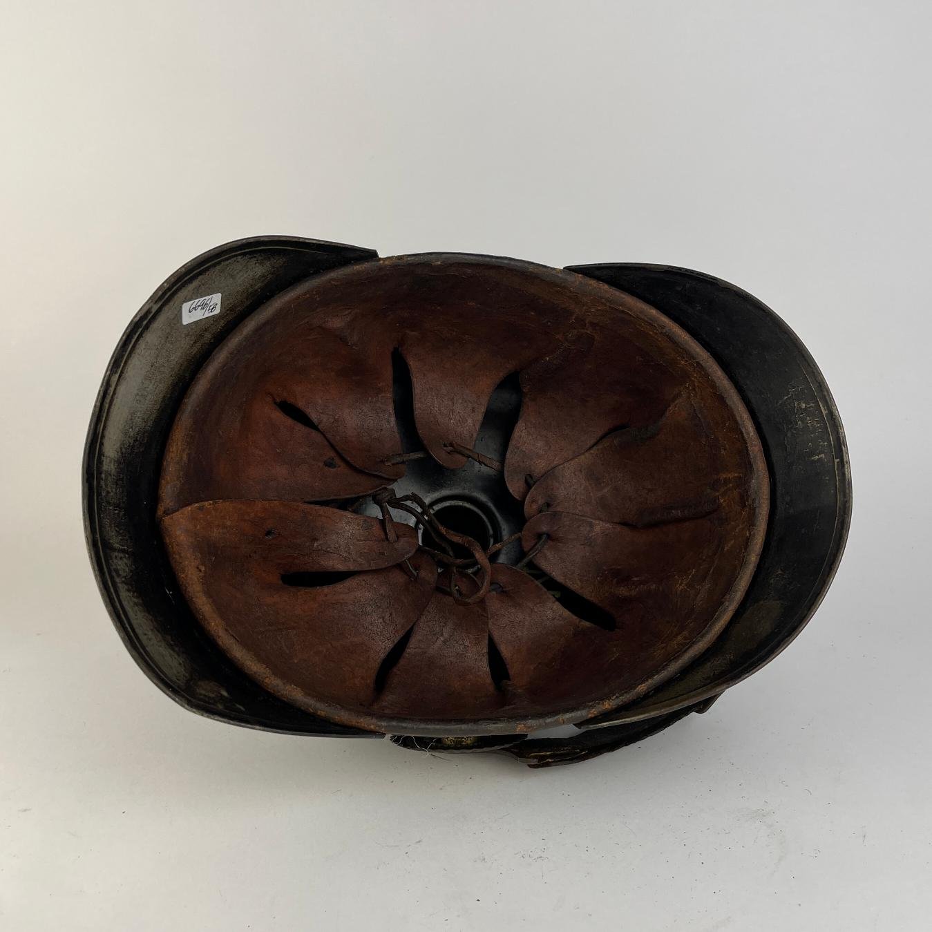 Casco pickelhaube prusiano, M1915, en acero, con pintura original. Insignia frontal y cocardas. Interior completo.