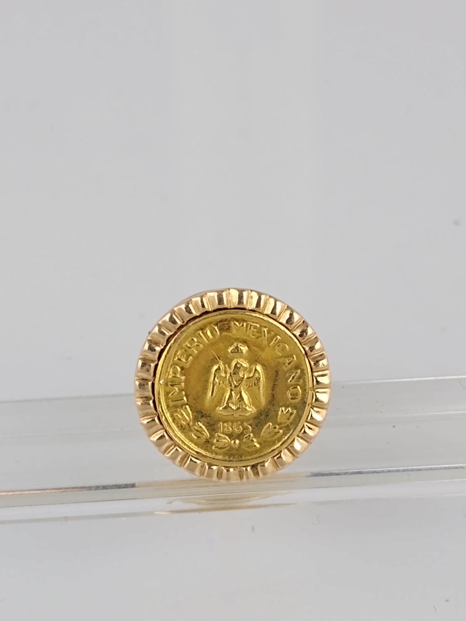 Pin solapero en oro 18 K amarillo con moneda mexicana en oro denominación un peso del año 1865, época Maximiliano I. Peso bruto 1.6 gr.