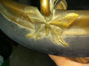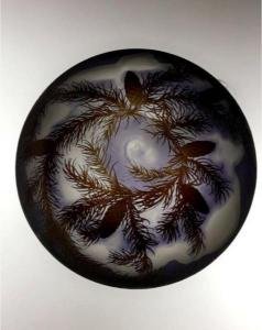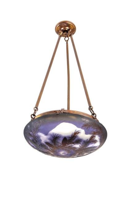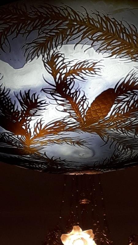 Plafón francés en cristal Gallé de color azul. «Aurora boreal.» Con sus herrajes en hierro y seis mariposas, originales.