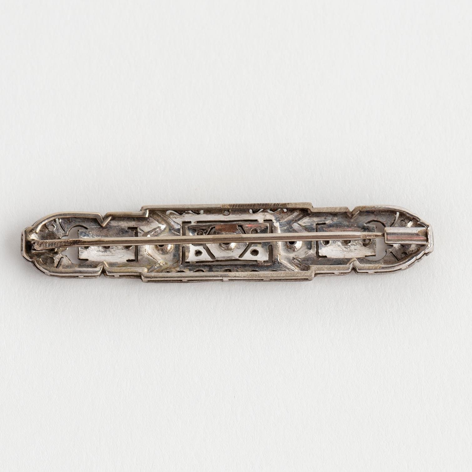 Plaqueta art decó en oro 18 K blanco totalmente decorada con diamantes y un brillante central. 11 x 54 mm. Peso bruto 5 gr.