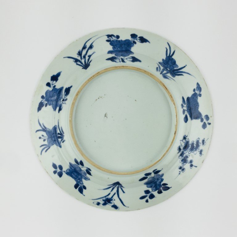 Plato chino, siglo XVIII, en porcelana azul y blanca decorada «escena típica». Diámetro 25 cm. Pequeñas cascaduras.