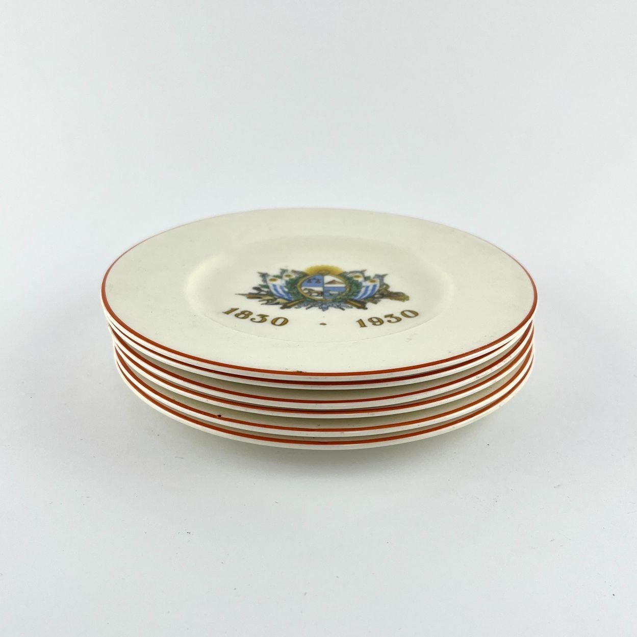 Seis platos en loza inglesa pertenecientes al juego de té conmemorativo del Centenario de la República Oriental del Uruguay de 1930. Diámetro 15 cm.