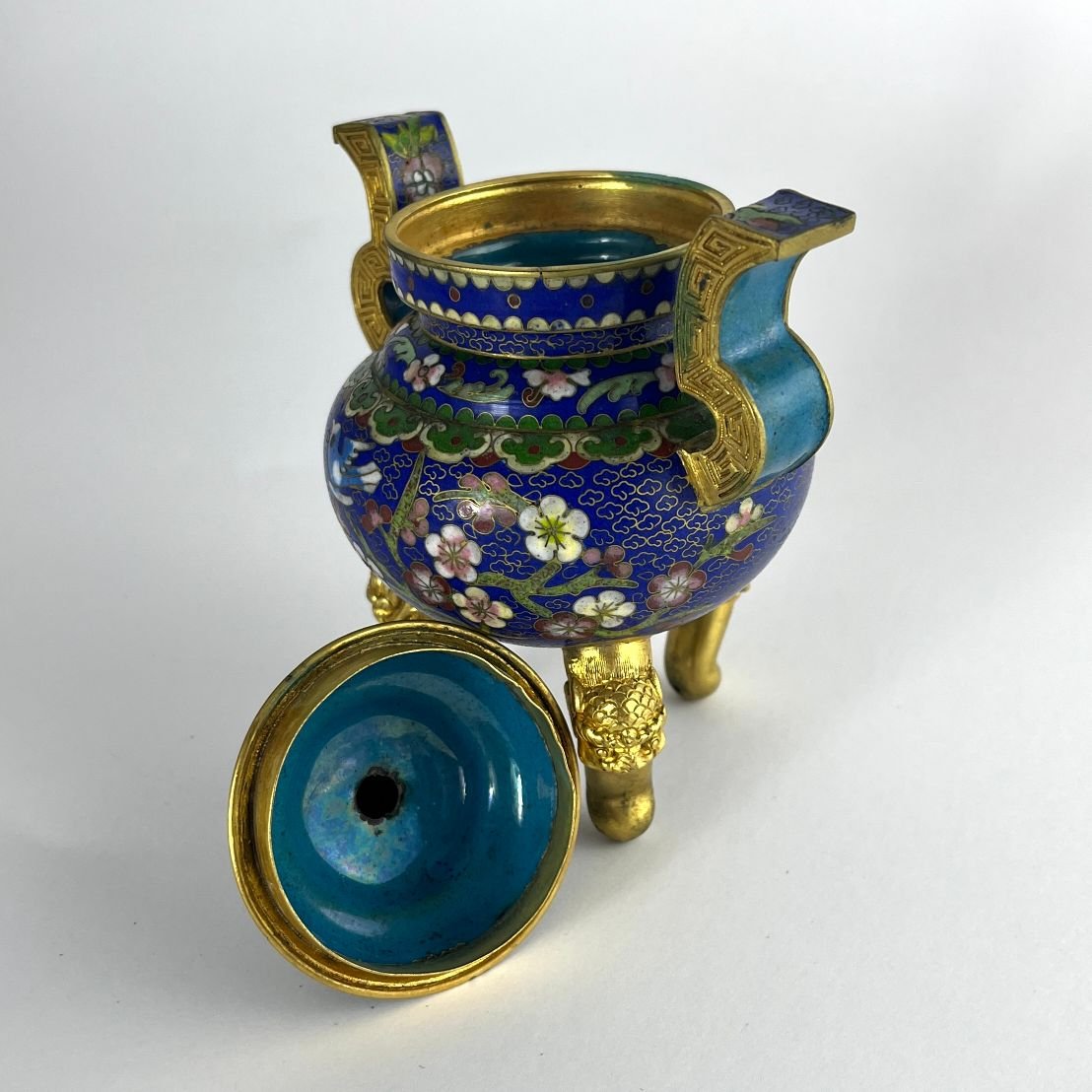 Potiche chino en bronce cloisonné decorado «aves y flores». Asas y tres patas en bronce dorado. 14.5 x 11 cm.