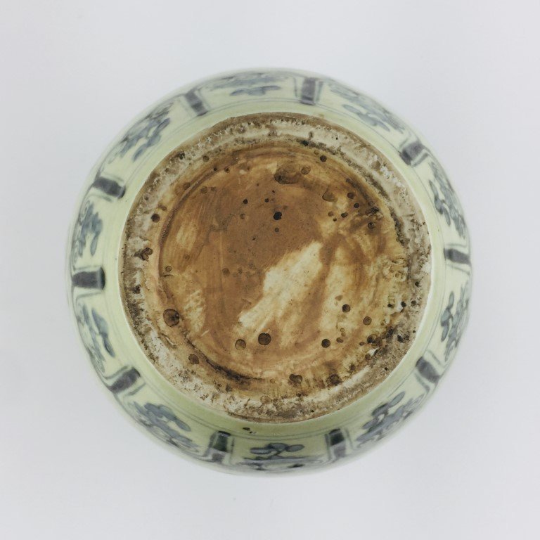 Potiche chino en porcelana azul y blanca decorado «escenas típicas» y «lagartijas» en relieve. Tapa decorada «flores». 20 x 19 cm.
