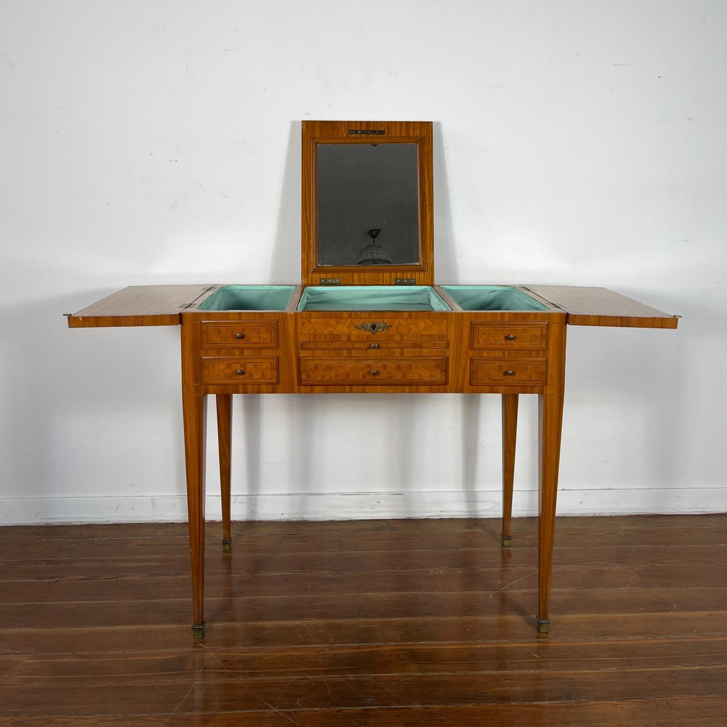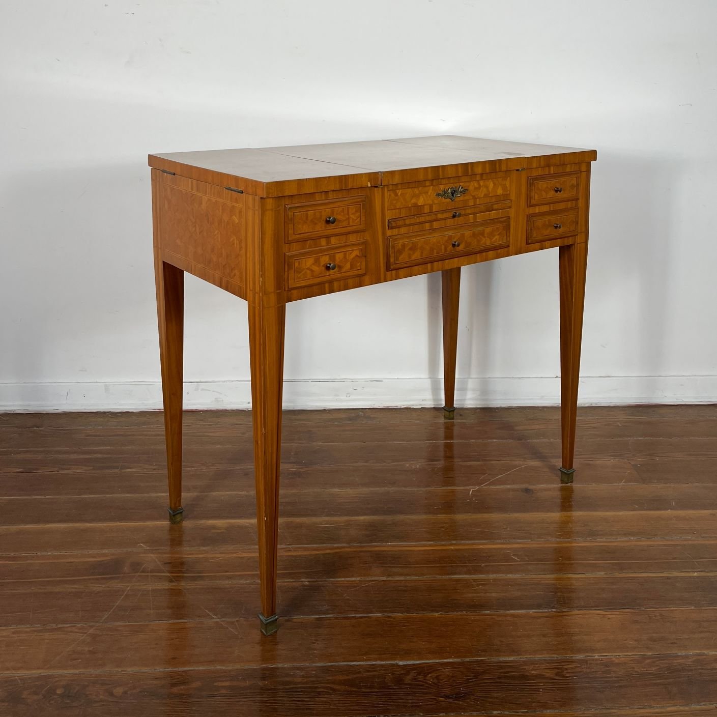 Poudruese francesa estilo Luis XV enchapada en palo de rosa con parqueterie. Tiradores, herrajes y regatones en bronce. 74 x 79 x 45 cm.