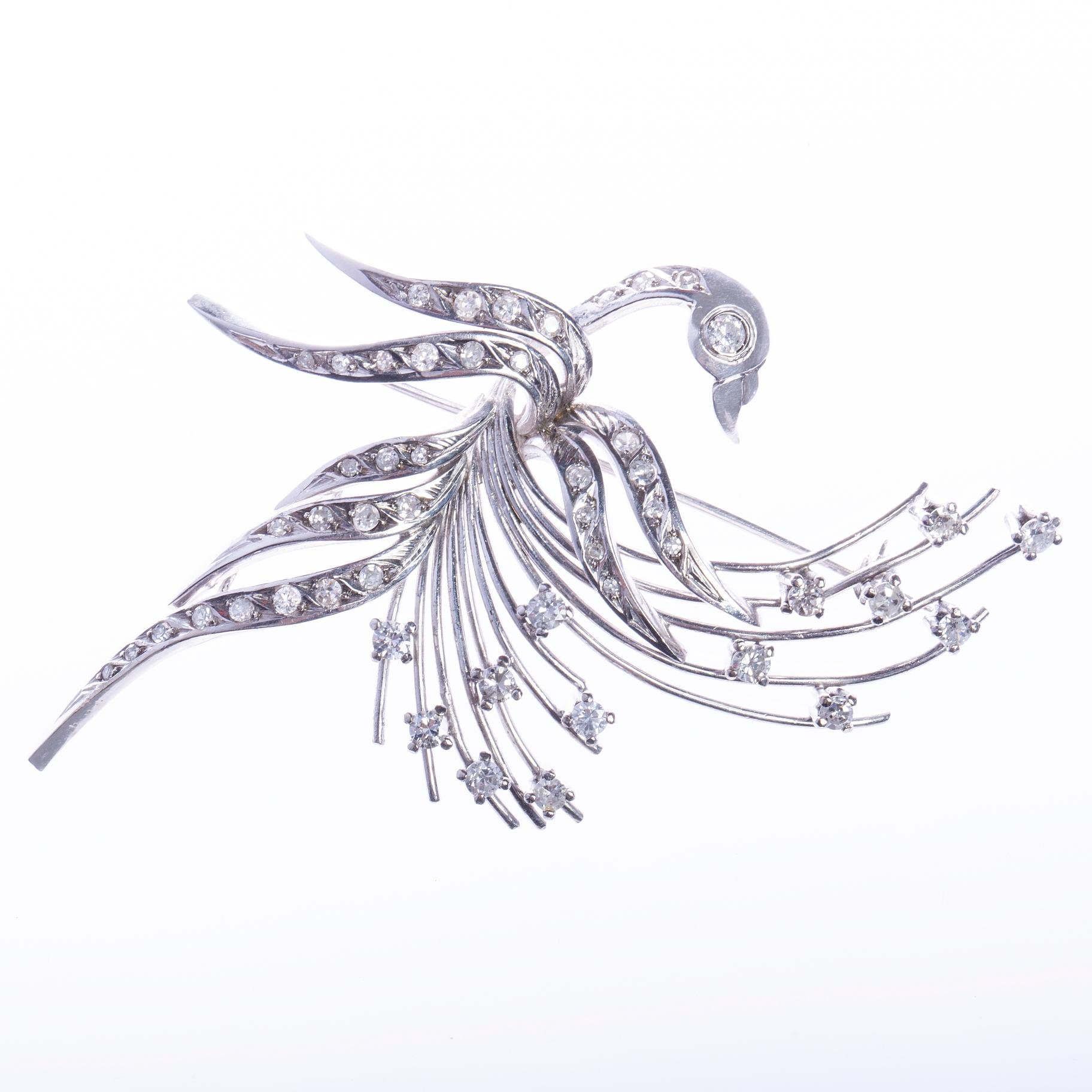Prendedor en oro 18 K blanco esculturado «flores y ave» decorado con cincuenta y dos pequeños brillantes. 42 x 76 mm. Peso bruto 15 gr. Con punzón de orfebre no identificado.