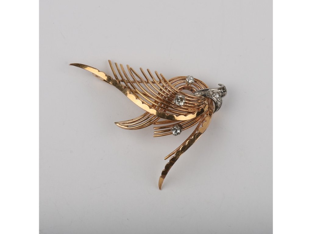 Prendedor años 1940s en oro 18 K amarillo y blanco esculturado «flor» con seis pequeños brillantes (espacio original para siete). 35 x 45 mm. Peso bruto 6 gr.