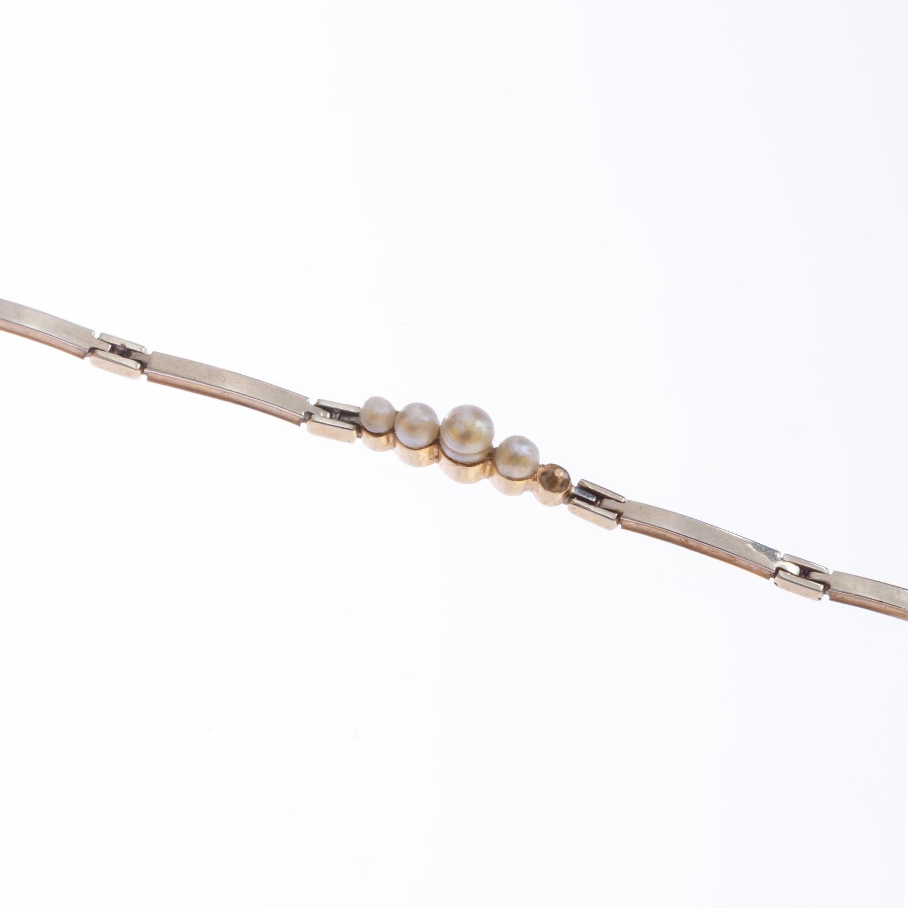 Pulsera en oro 18 K amarillo con cuatro pequeñas perlas (con espacio original para cinco). Peso bruto 4,8 gr.