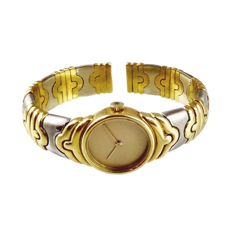 Juego de pulsera y reloj pulsera flexibles en oro 18 K amarillo y gris. Ancho pulsera 13 mm. Peso bruto 131 gr.