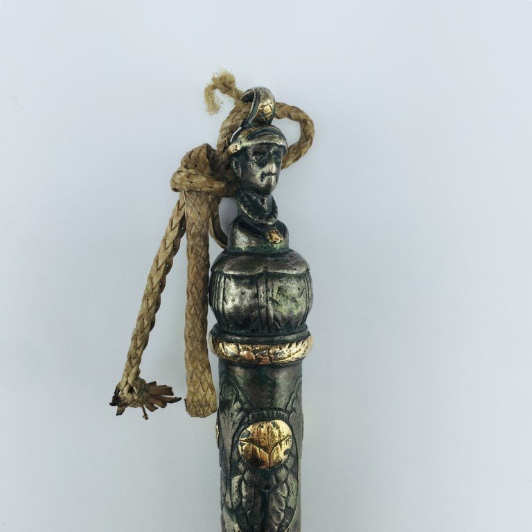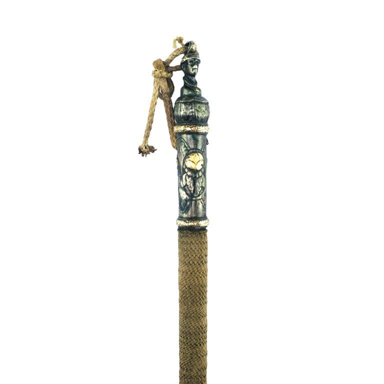 Rebenque forrado en fino cuero trenzado. Cabo en plata y oro cincelados «hojas y flores» y esculturado «jockey».