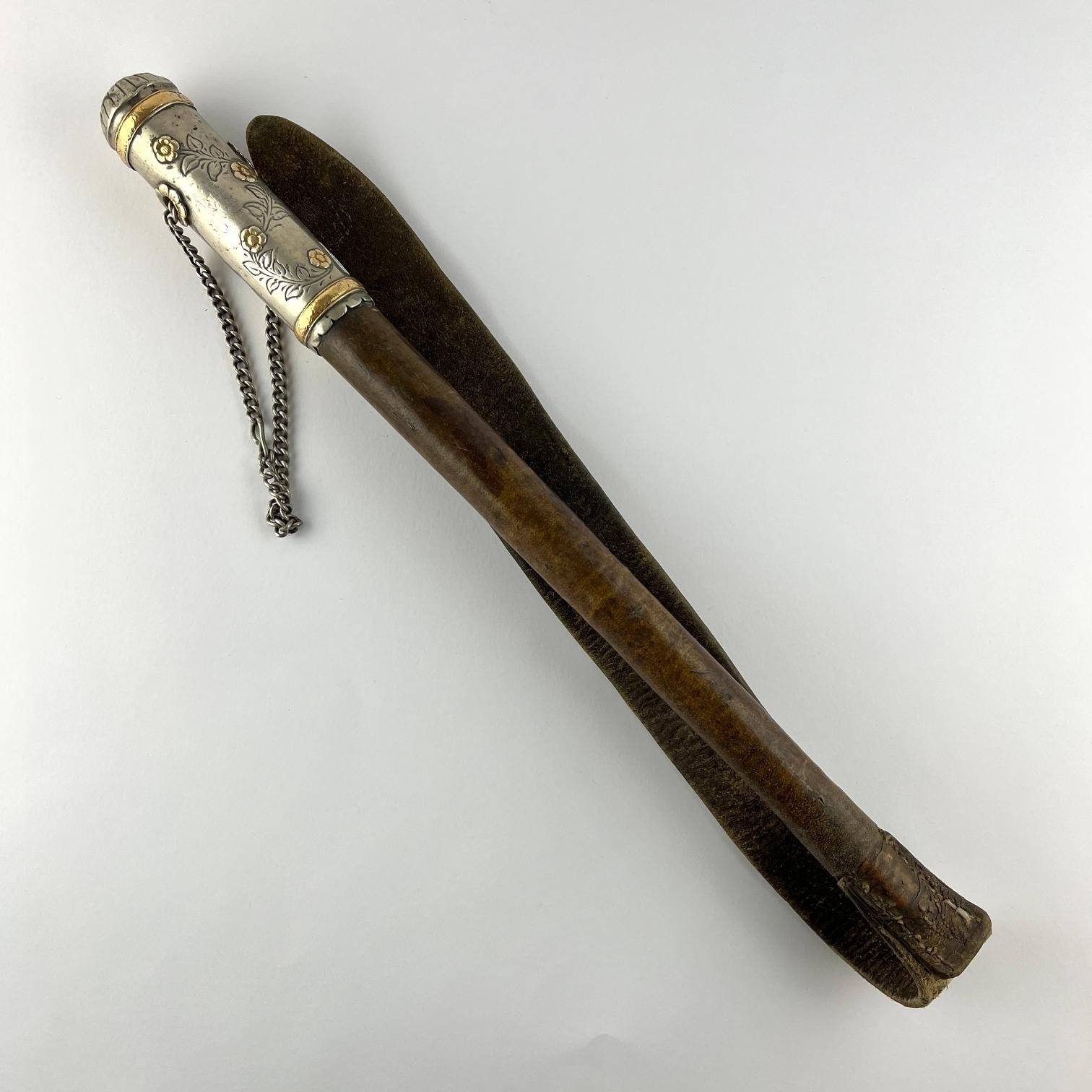 Rebenque argentino forrado en cuero, con cabo en plata y oro cincelado hojas y flores y cadenilla en plata lisa.