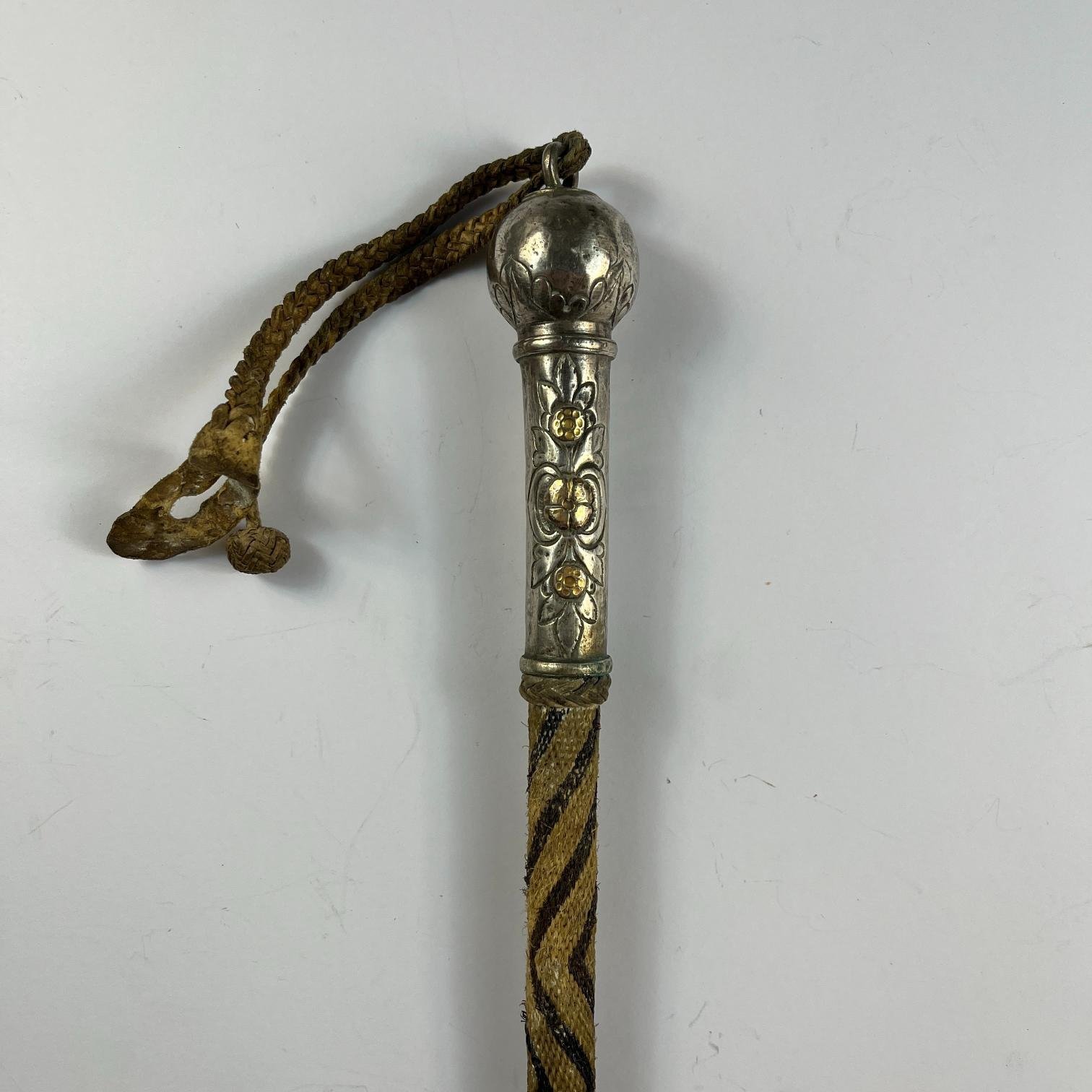 Rebenque forrado en crin negra y blanca, con cabo en plata y oro cincelado «hojas y flores».