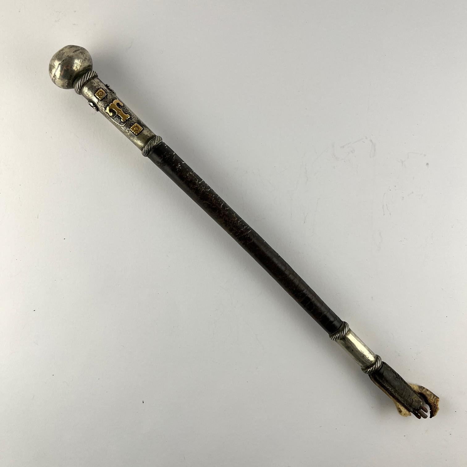 Rebenque forrado en cuero con cabo en plata y oro cincelado “hojas y flores”, iniciales “R.T.” en oro y pasador en plata lisa. Falta sotera.