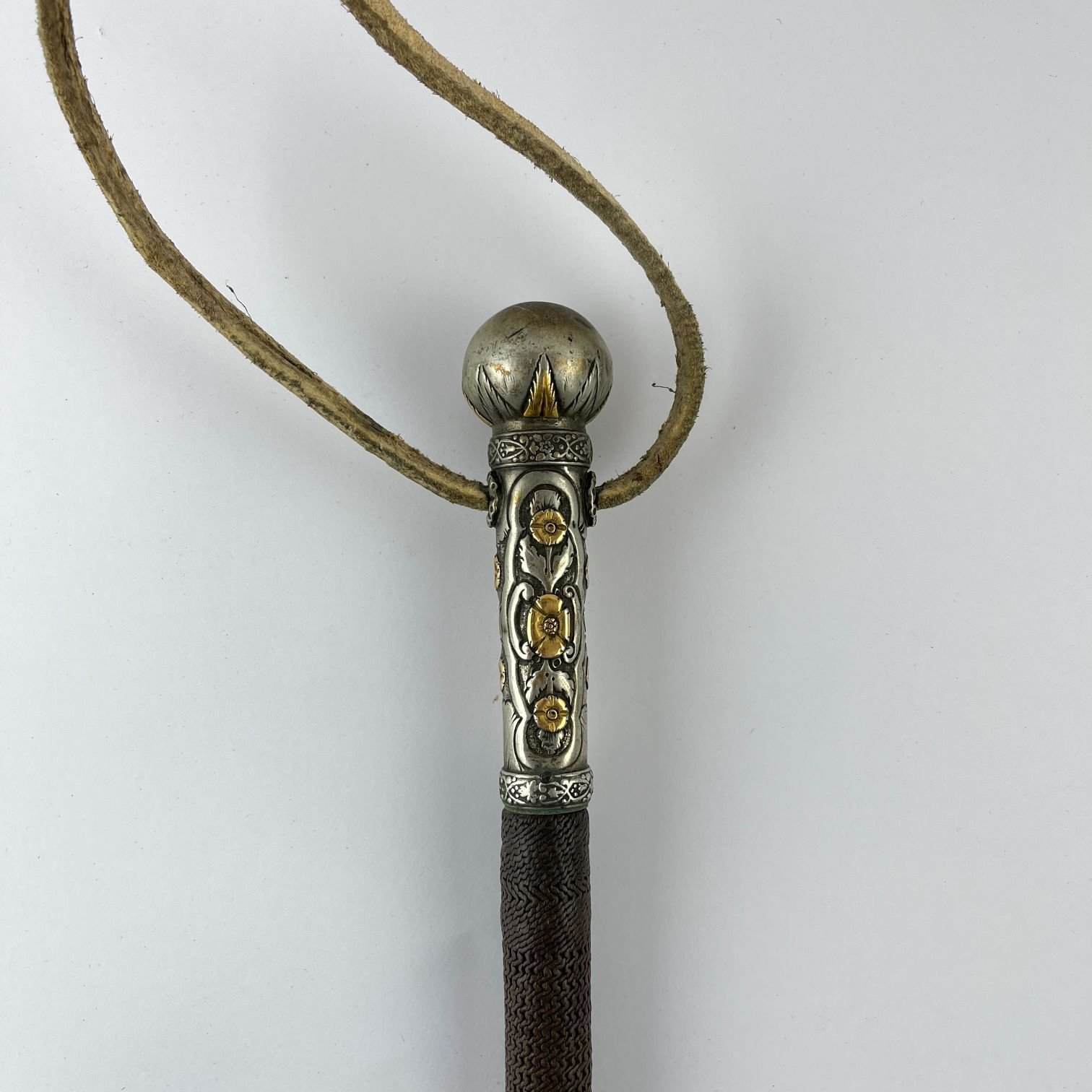 Rebenque forrado en fino cuero trenzado con cabo en plata y oro cincelado «hojas y flores».