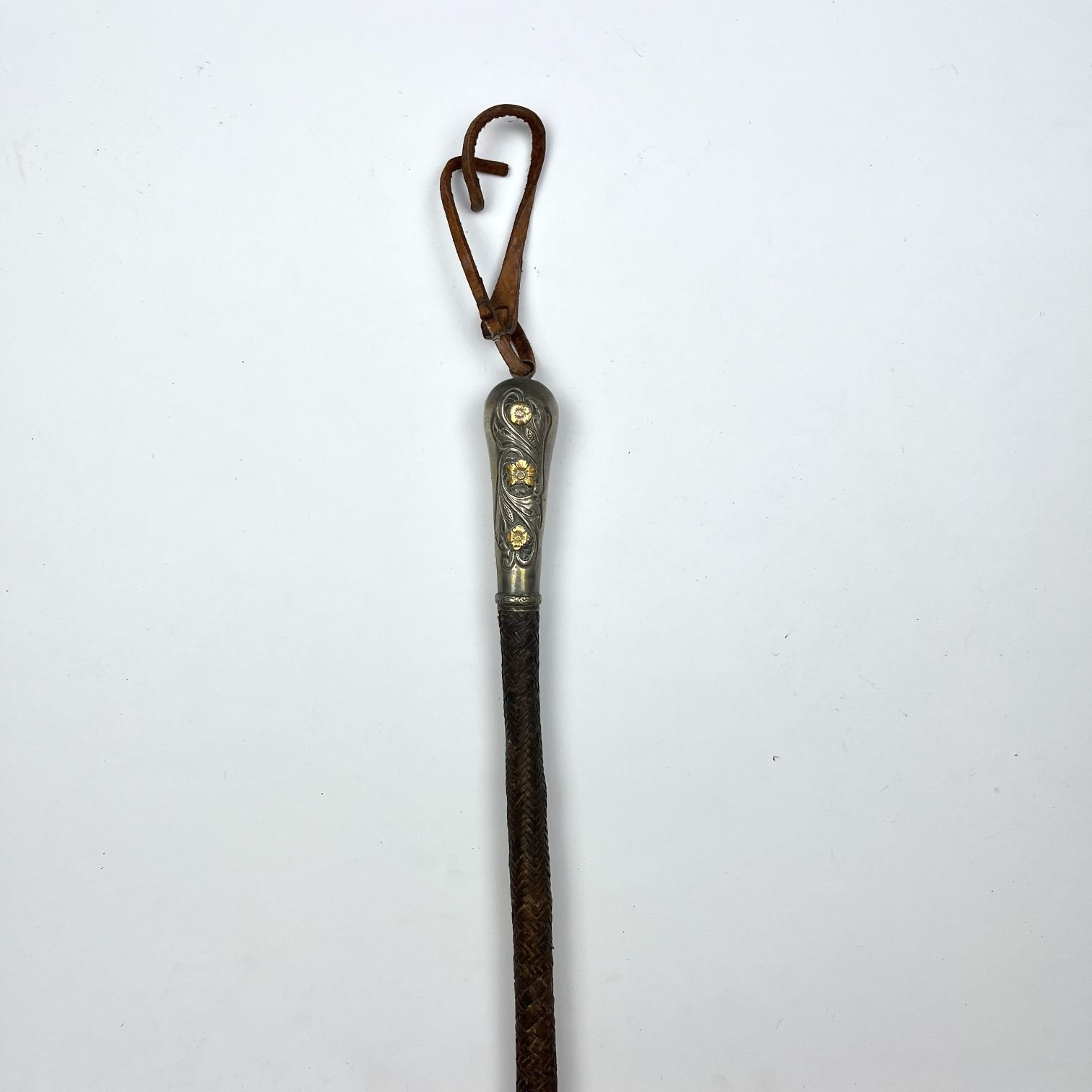 Rebenque forrado en fino cuero trenzado, con cabo en plata y oro cincelado «hojas y flores».
