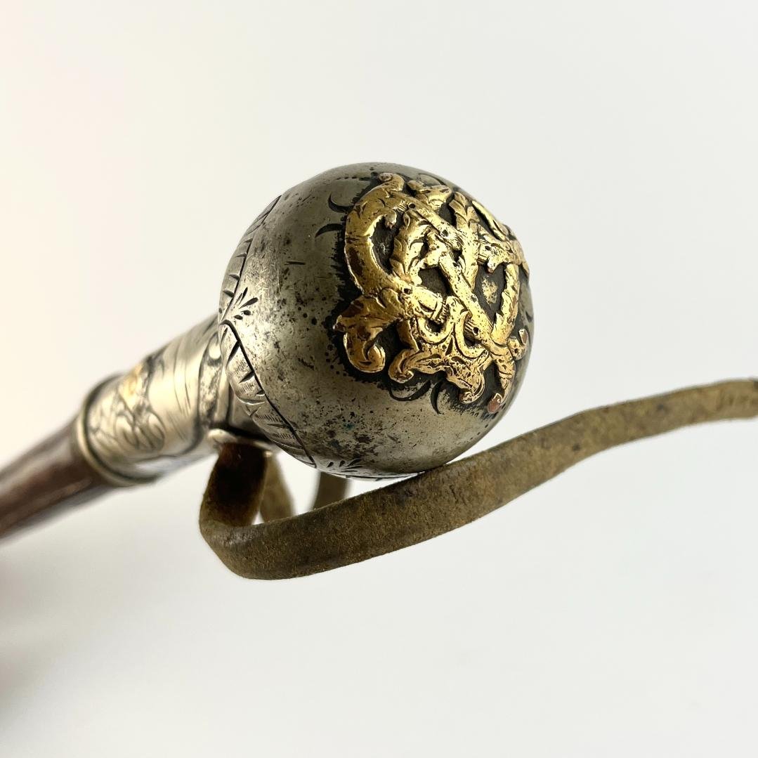 Rebenque forrado en cuero marrón con cabo en plata y oro cincelado «hojas y flores» e iniciales «R.E.» en oro.