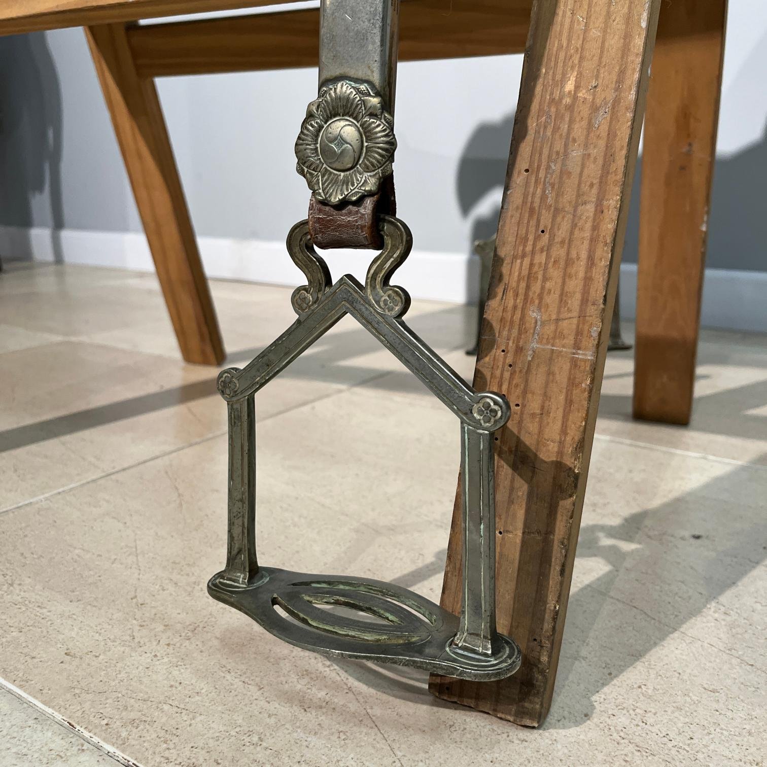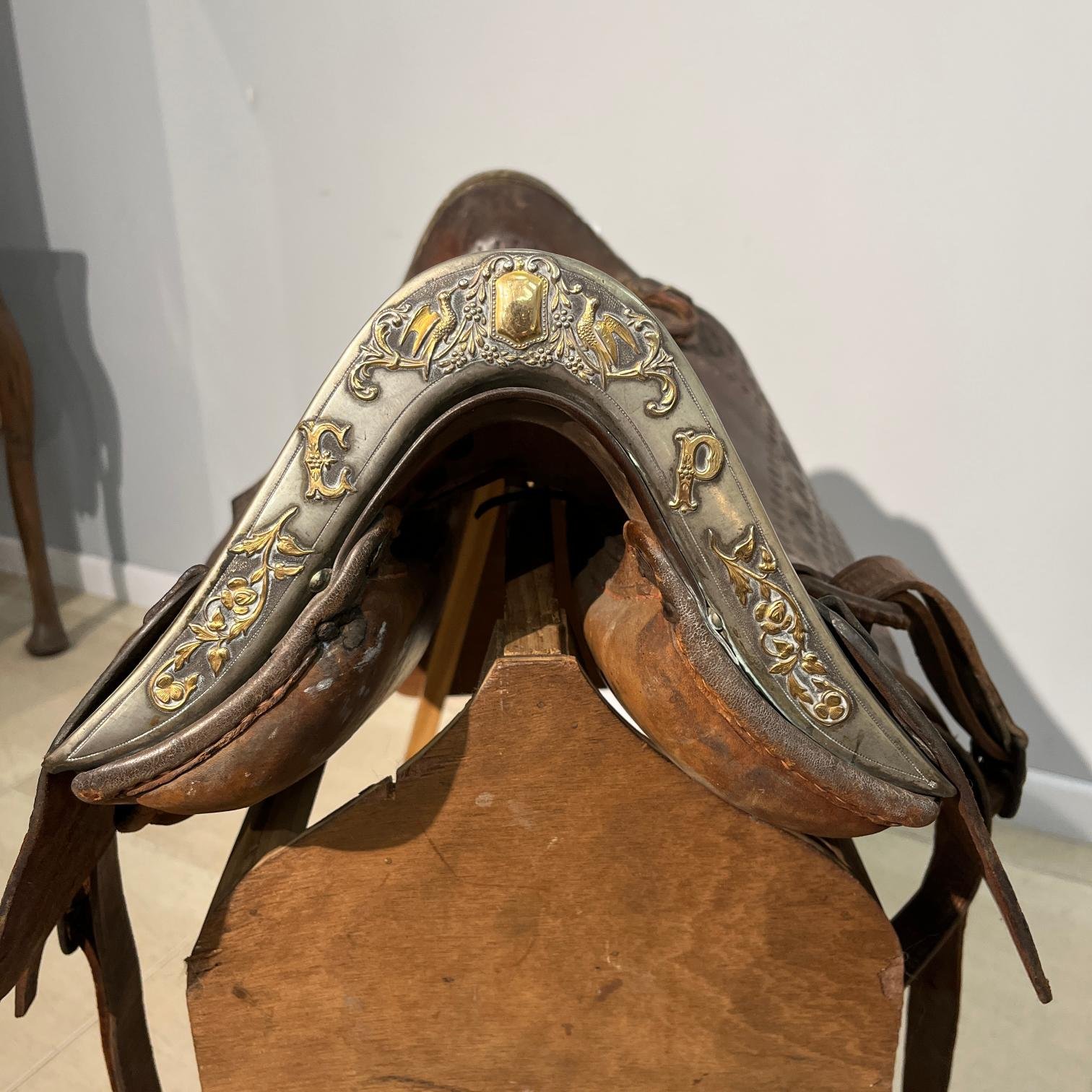 Recado en cuero marrón repujado, con cabezadas en plata y oro cinceladas «hojas, flores y aves» e iniciales «E.P.», estriberas en suela con pasadores chatos en metal «Sol» de Broqua & Scholberg, Montevideo, decoradas «flor», y estribos tipo rancho en metal «Triángulo». Fisura central en cuero.