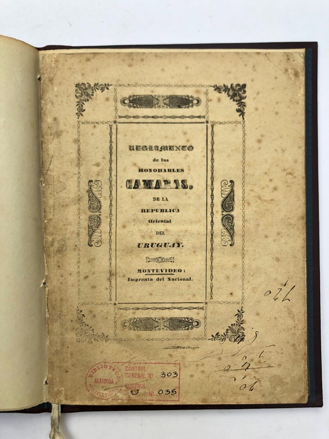 Reglamento de las honorables Cámaras de la República Oriental del Uruguay. Montevideo, Imprenta del Nacional. 1828. Encuadernación en pleno cuero.