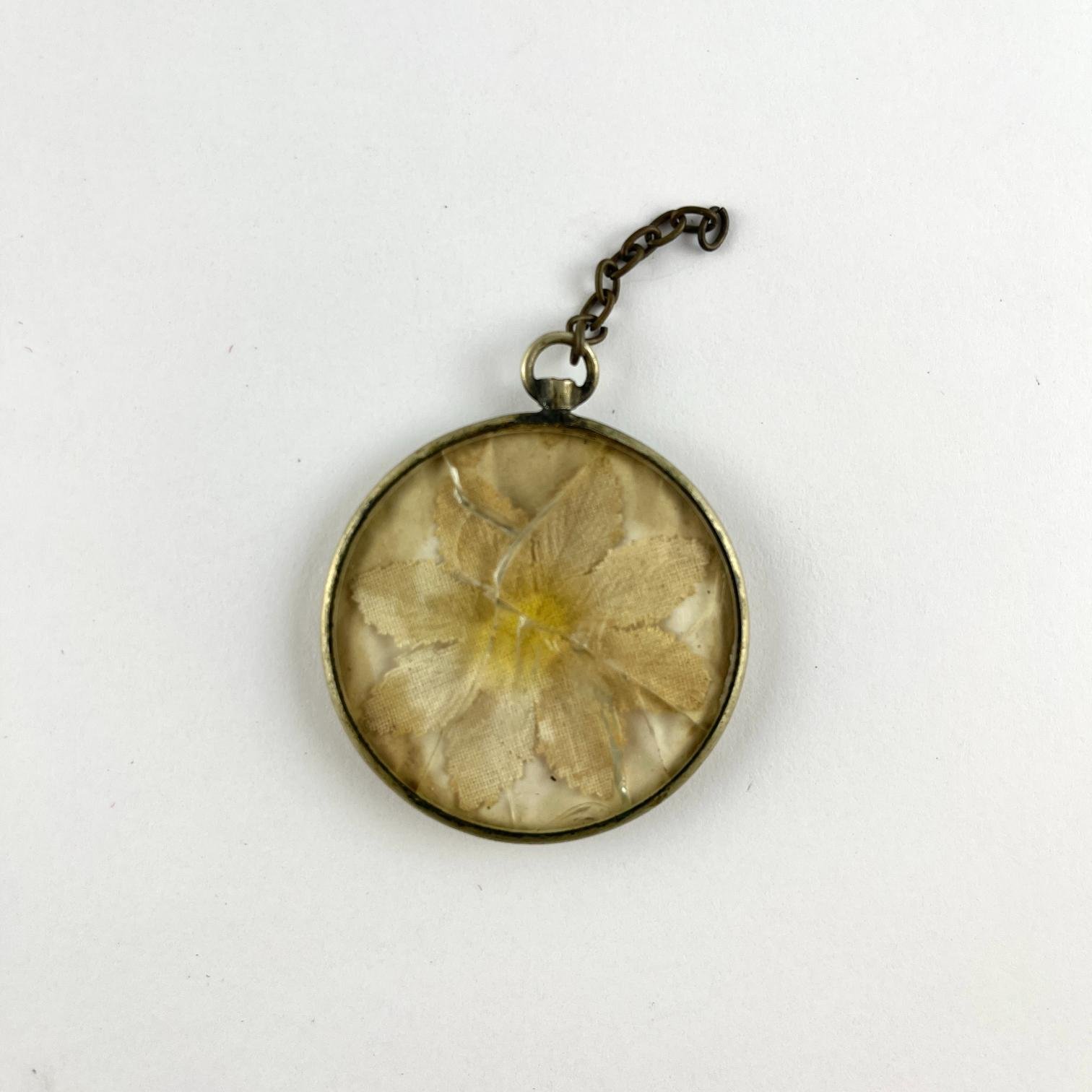 Relicario de colgar enmarcado en plata, con imagen del Gral. Aparicio Saravia y flor en seda color blanco al interior y centro pintado al óleo en color amarillo. Vidrio averiado.