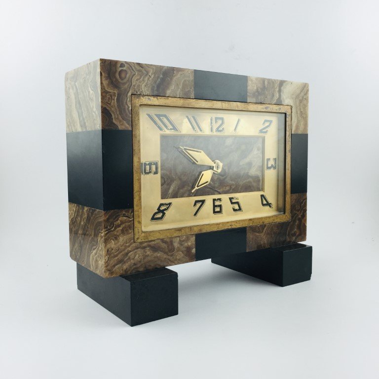 Reloj de sobremesa art decó. Caja en mármol marrón y granito negro. Esfera y agujas en bronce. Funcionando. 24 x 27 x 13 cm.
