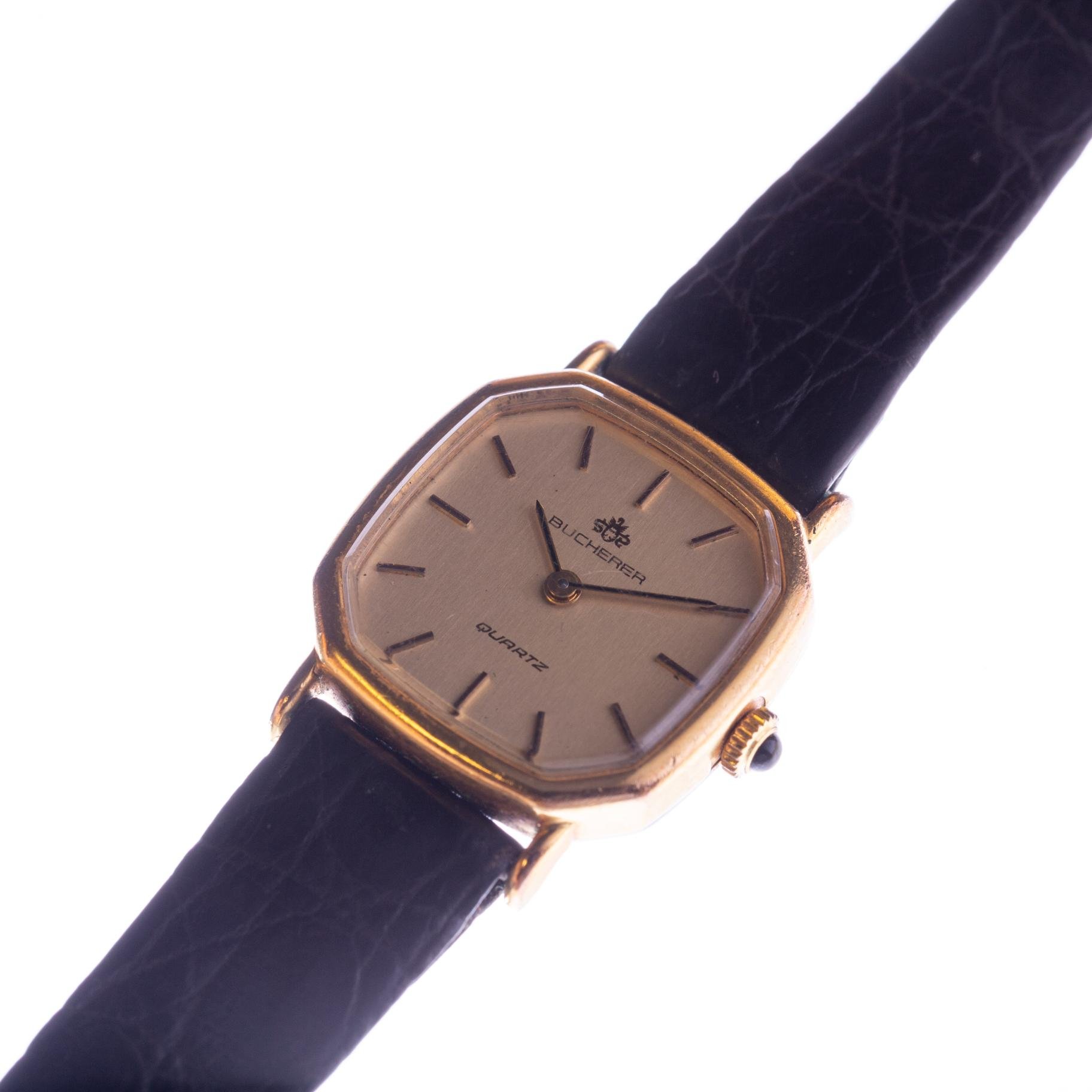 Reloj pulsera suizo para dama marca Bucherer, cuarzo. Esfera dorada. Caja enchapada en oro, con tapa en acero. No funciona.