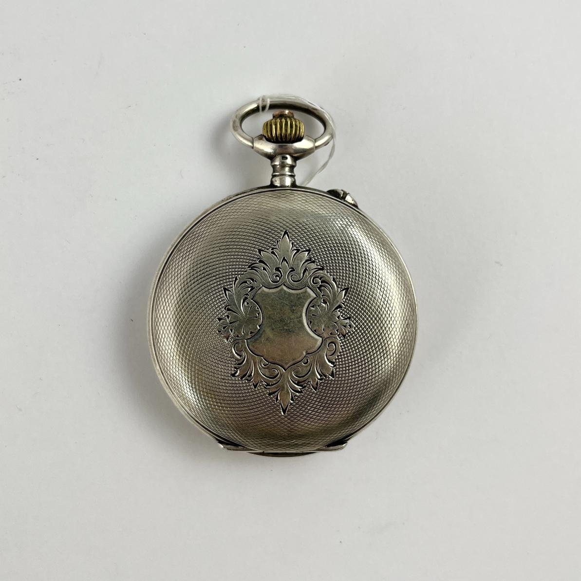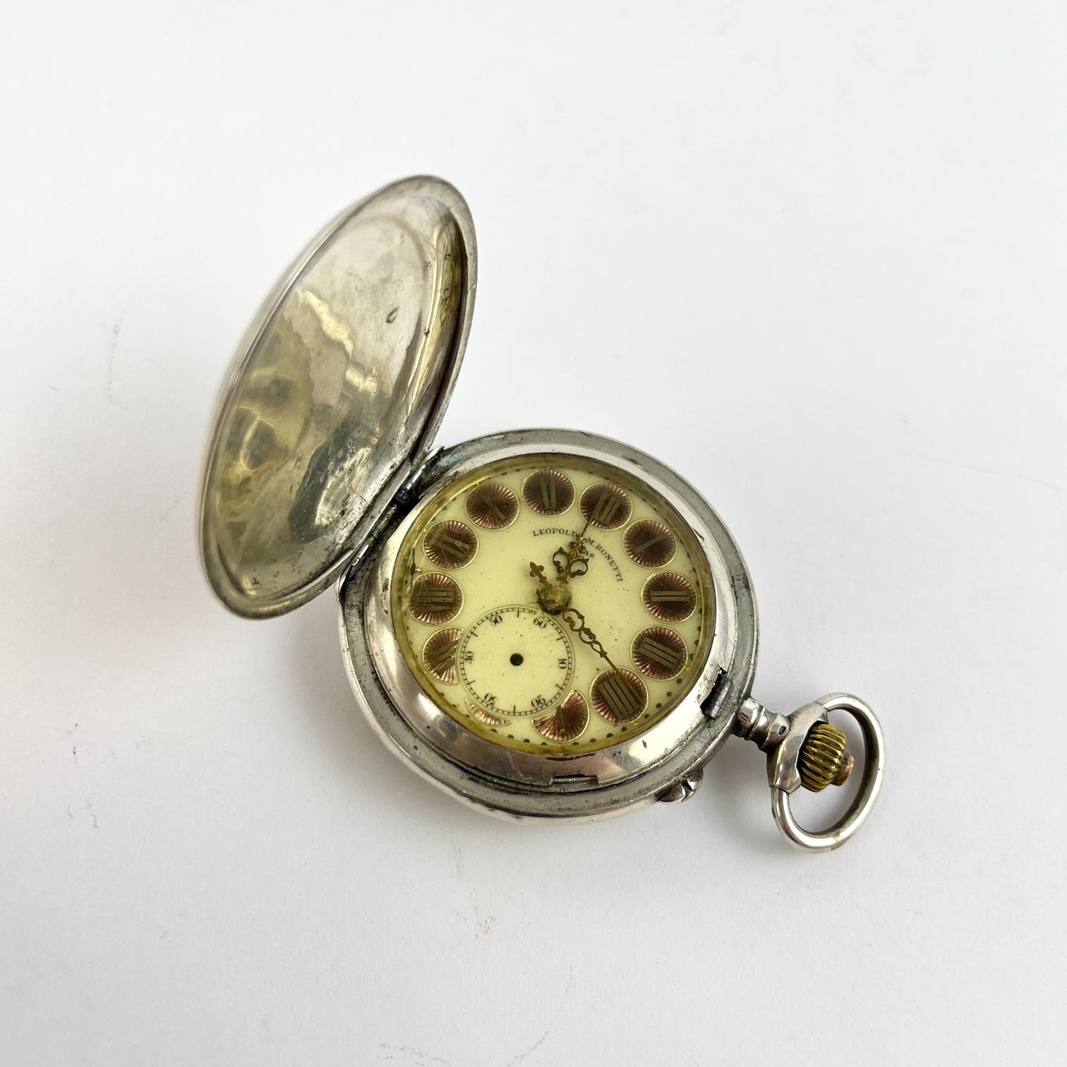 Reloj de bolsillo suizo. Esfera con doble marca de la joyería Leopoldo M. Bonetti, Minas. Esfera esmaltada con números romanos. Caja en plata segrinada. Diámetro de caja 50 mm. No funciona.