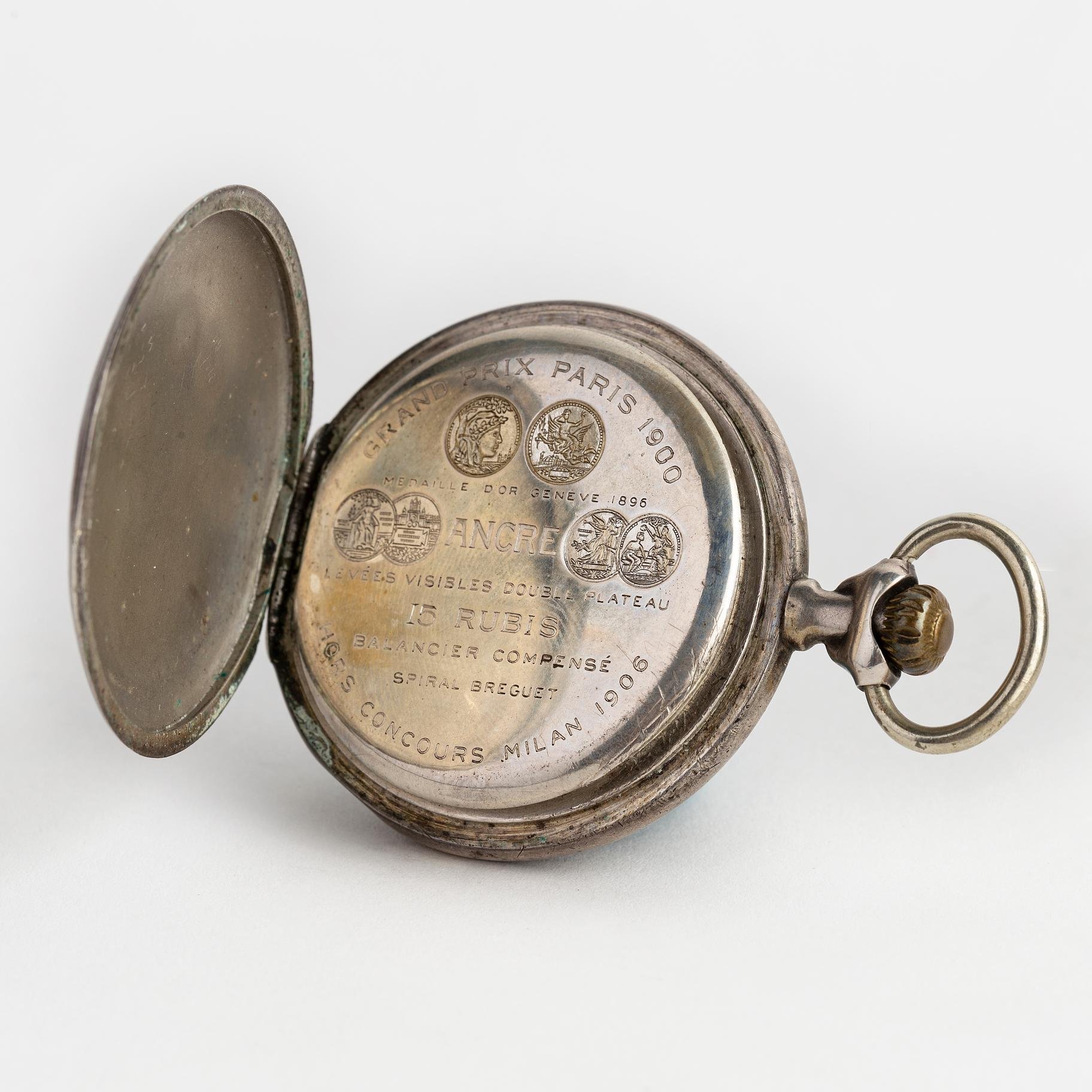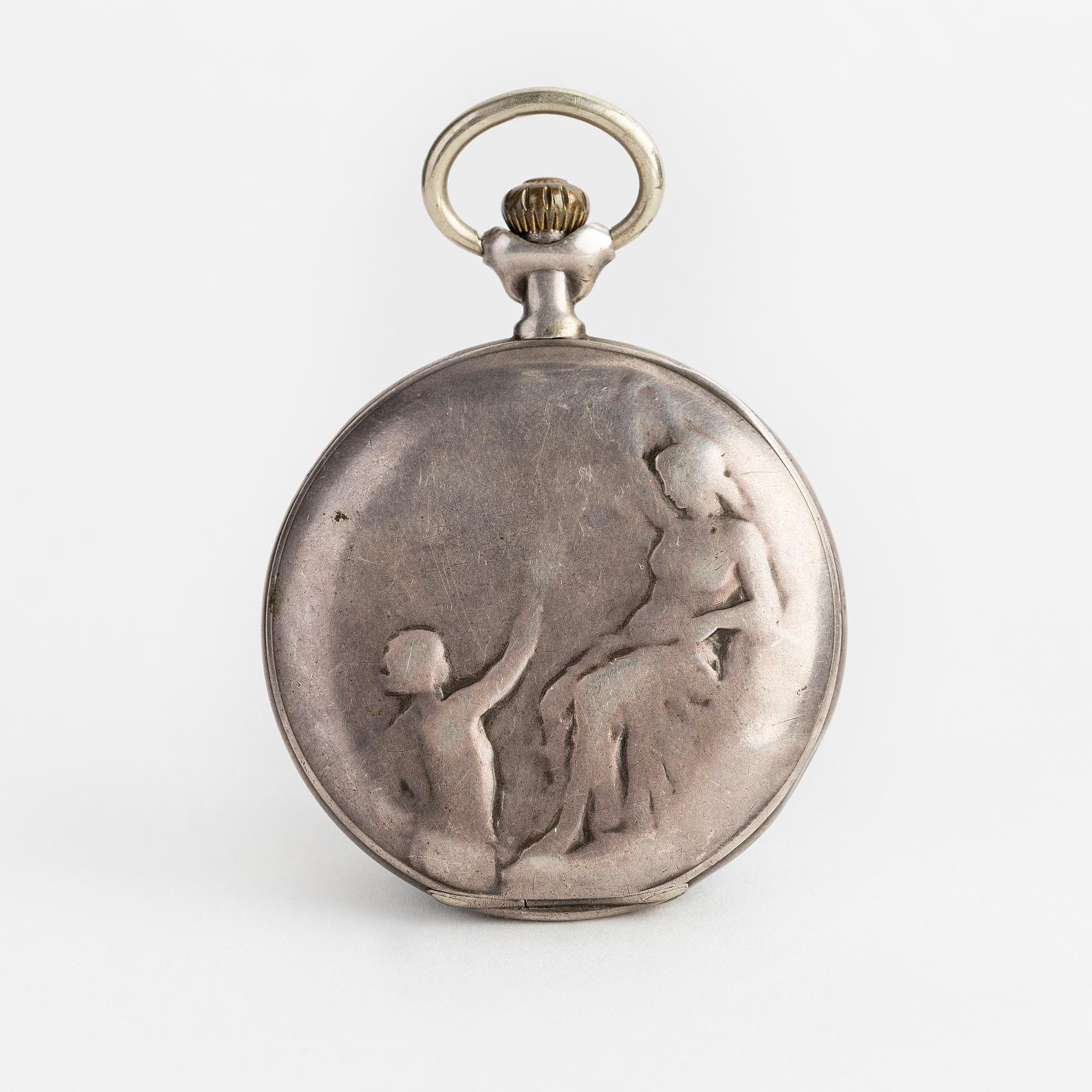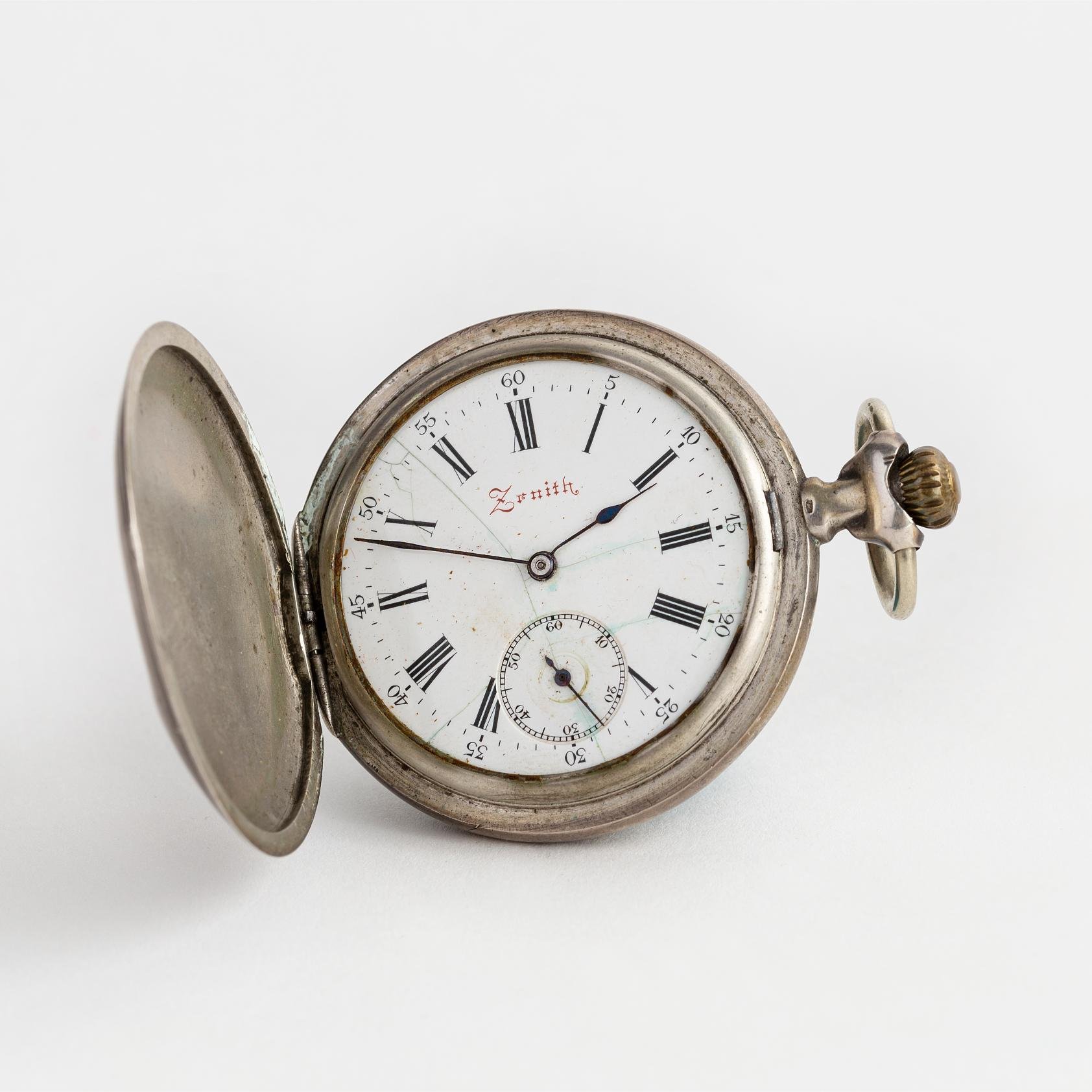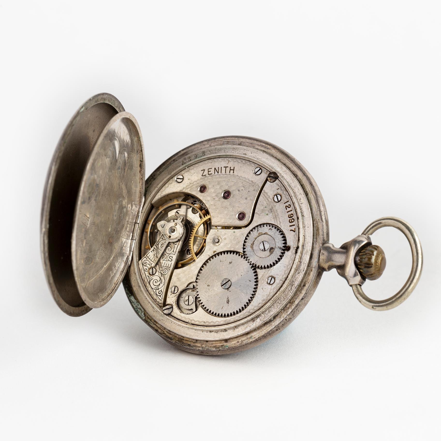 Reloj suizo de bolsillo marca Zenith, en plata. Caja de dos tapas en plata, cinceladas «damas». Diámetro 50 mm. Funcionando.