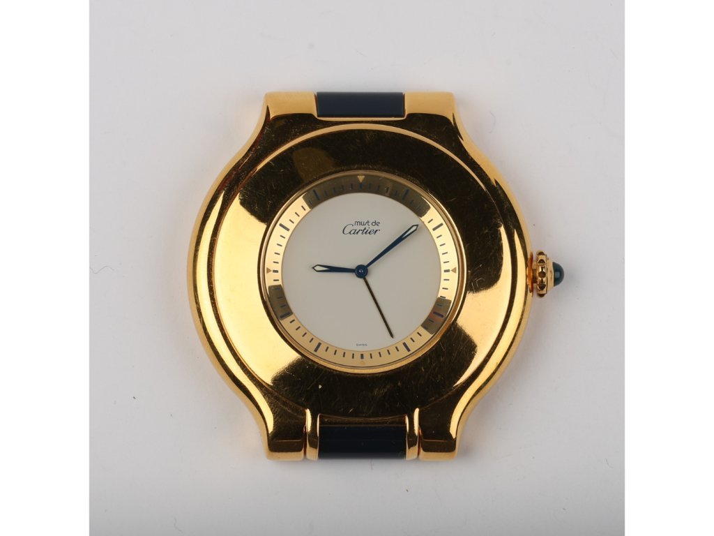 Reloj francés de viaje marca Cartier modelo Must, cuarzo. Caja en bronce dorado. Esfera color blanco. Aro con números romanos en esmalte azul. Diámetro de caja 56 mm.