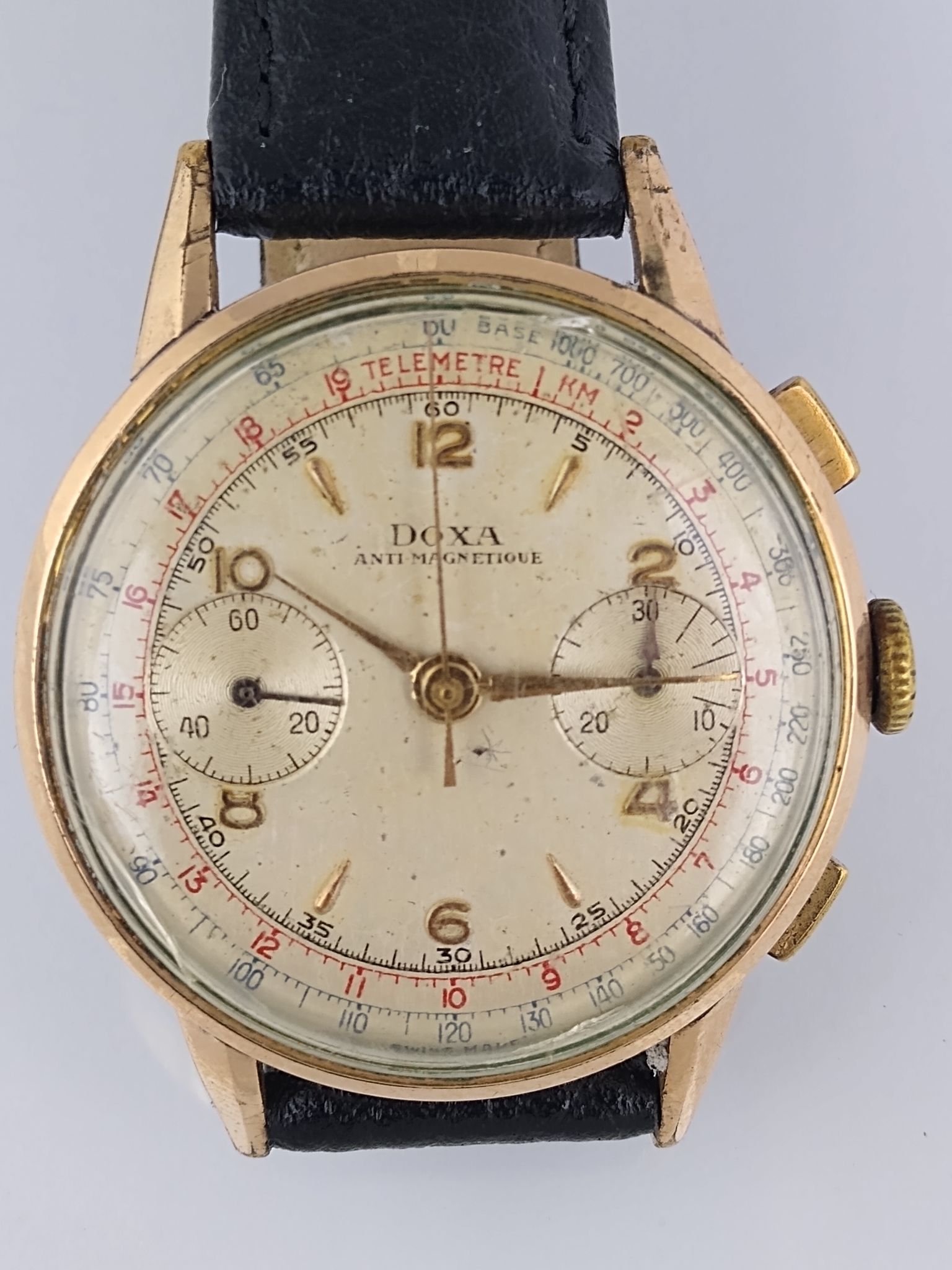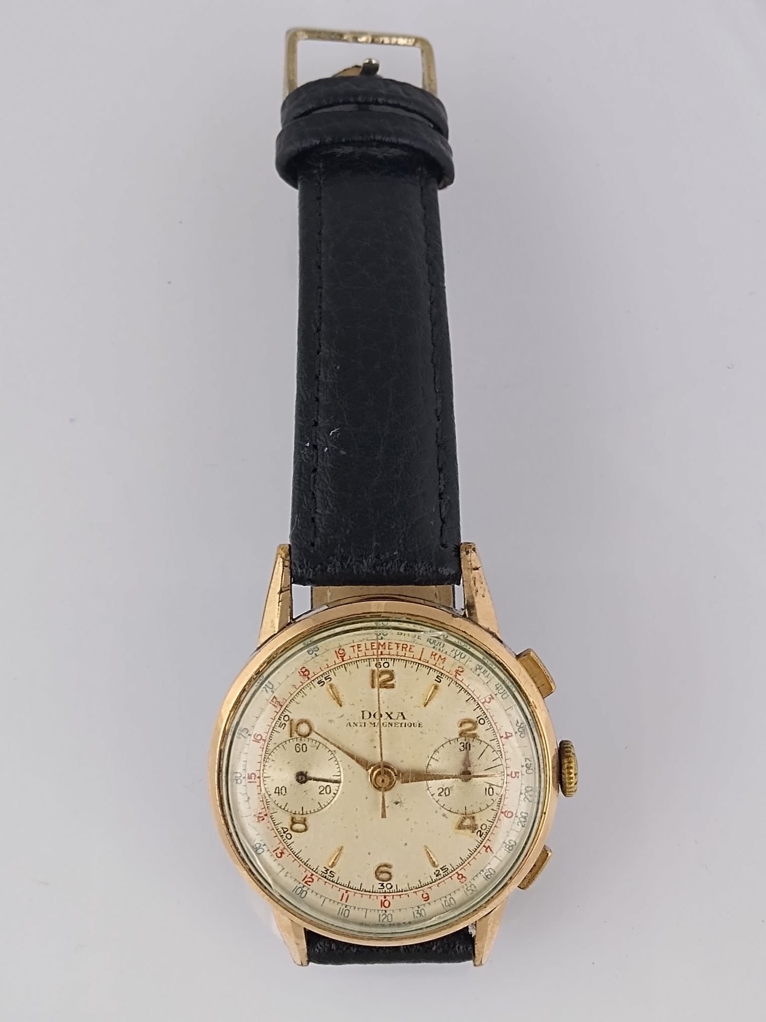 Reloj pulsera suizo para hombre marca Doxa modelo Antimagnetic. Con cronógrafo Bicompax. Caja enchapada en oro con tapa en acero de un diámetro 37 mm. Correa en cuero negro, no original. Funcionando. Pequeñas manchas de humedad en cuadrante.