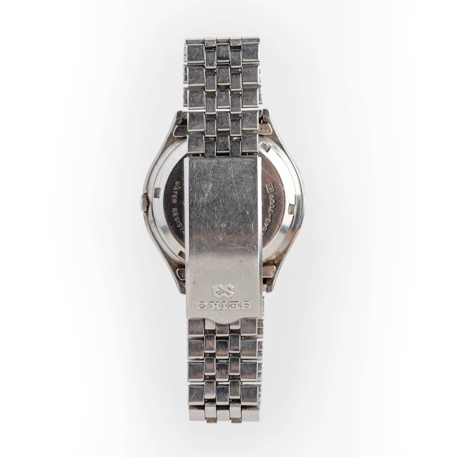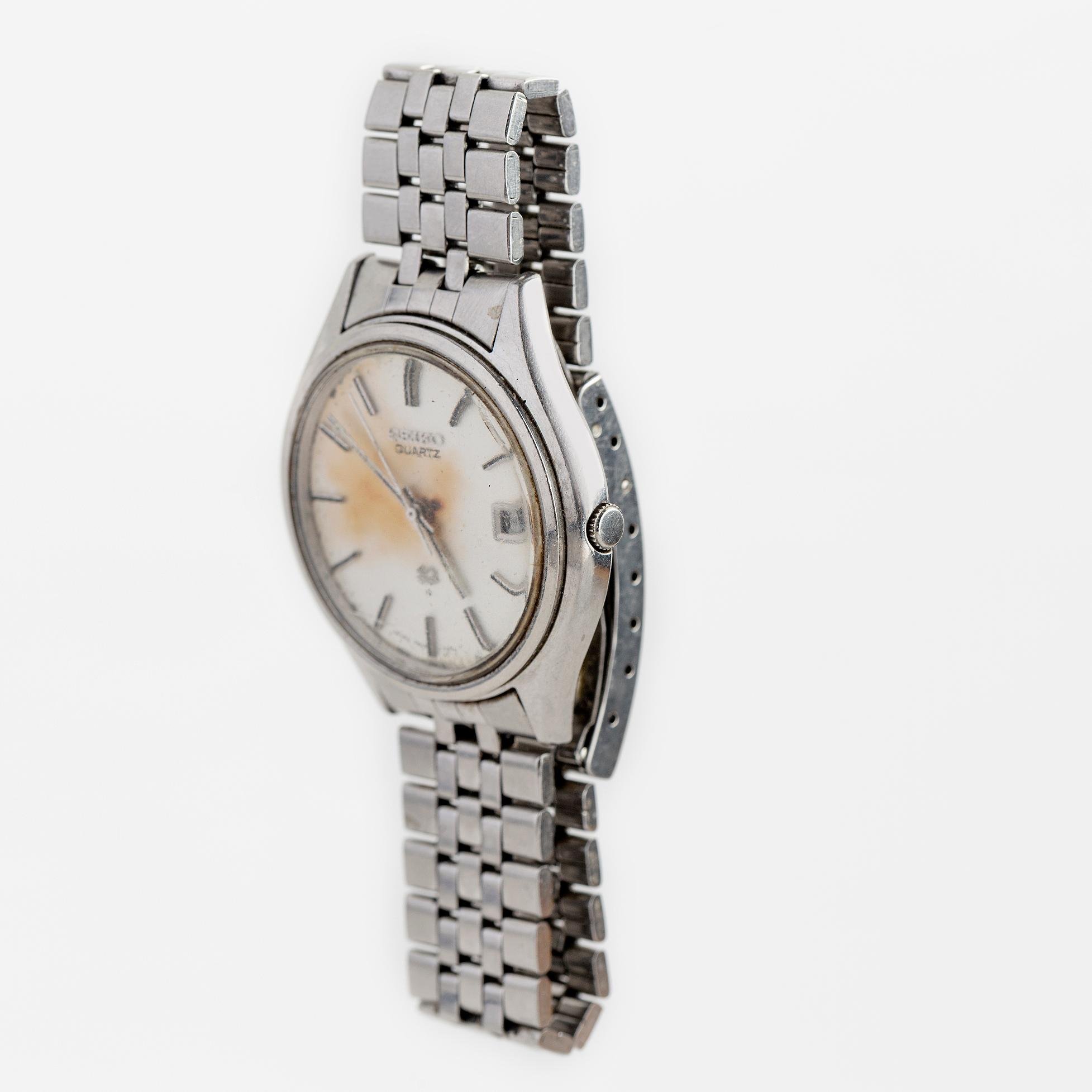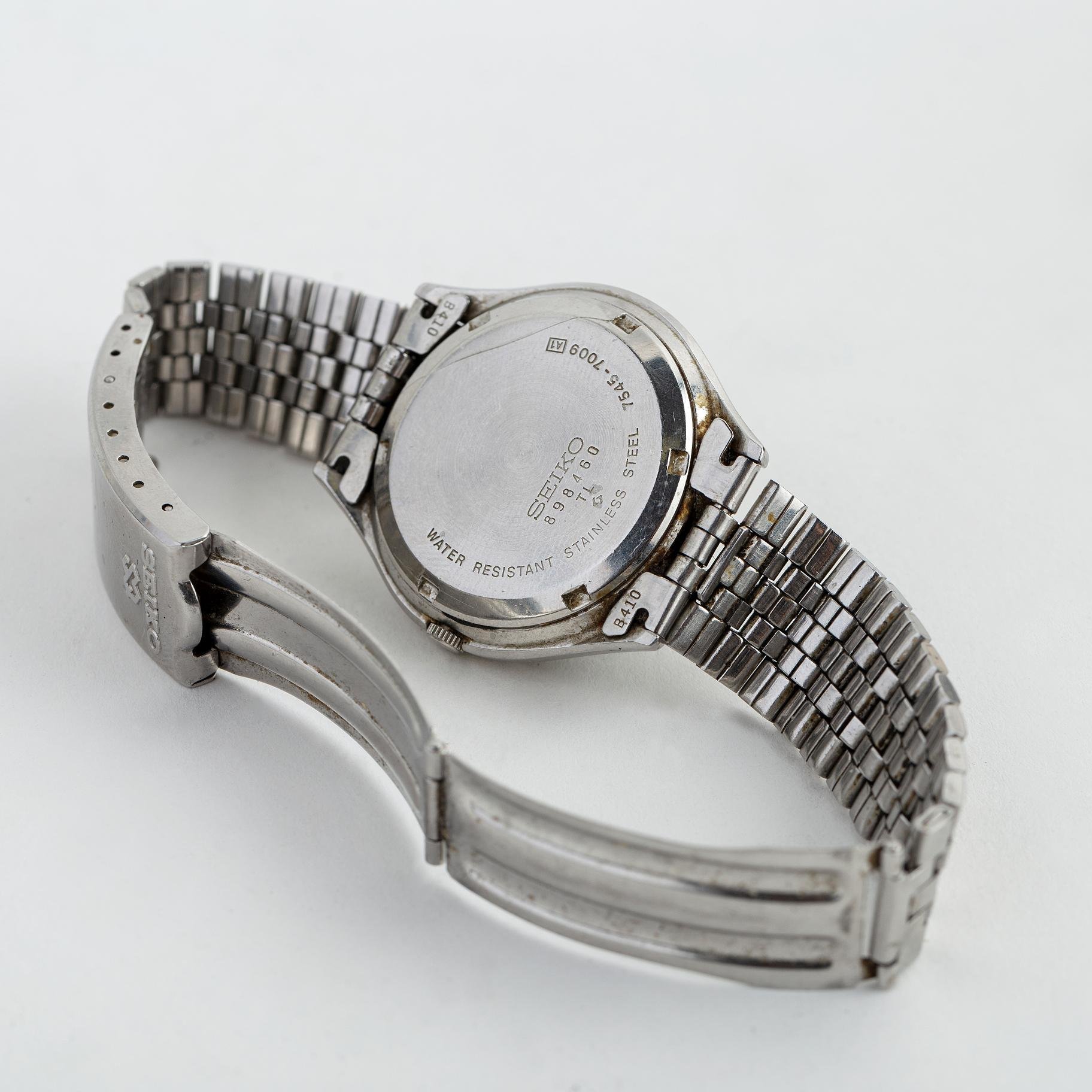Reloj pulsera para hombre marca Seiko, a cuarzo. Esfera plateada con calendario, manchada. Caja y malla en acero inoxidable. Funcionando. Esfera con manchas.