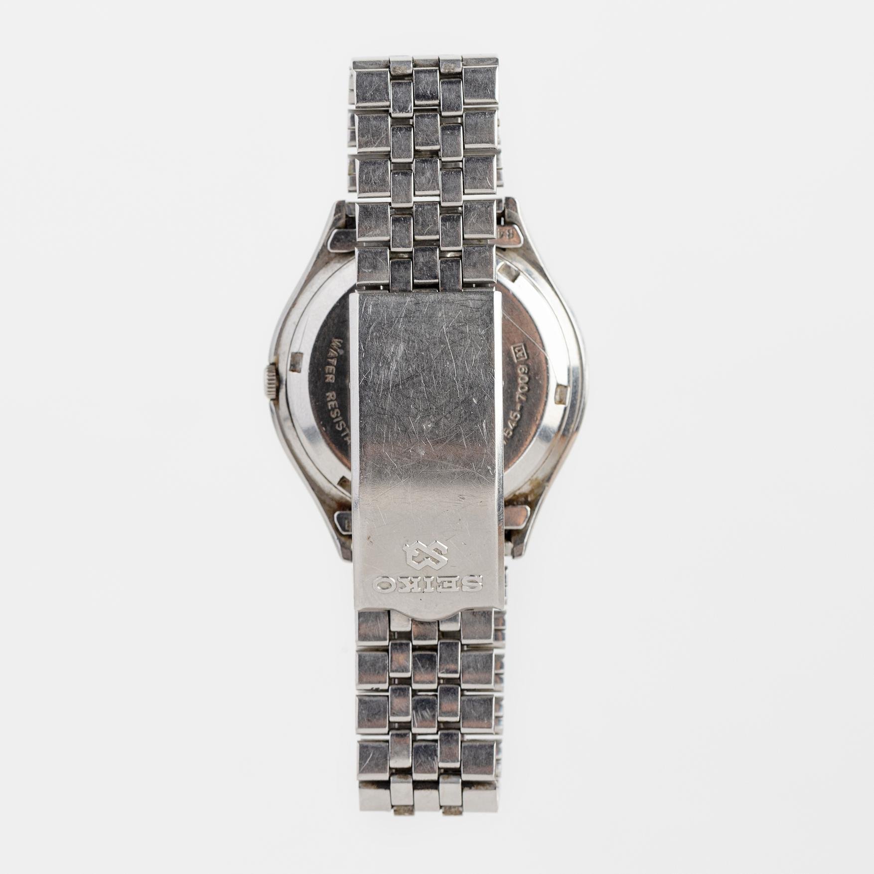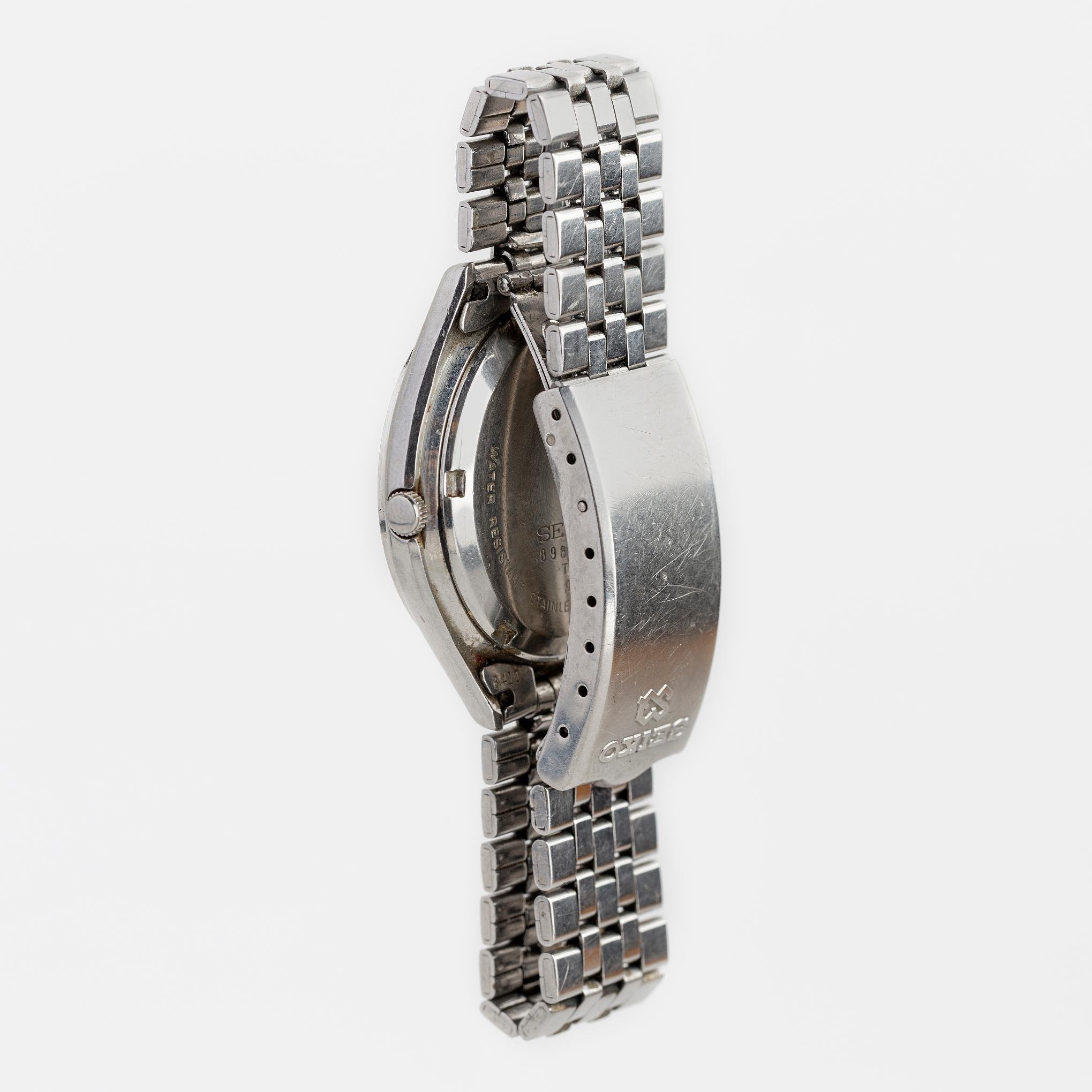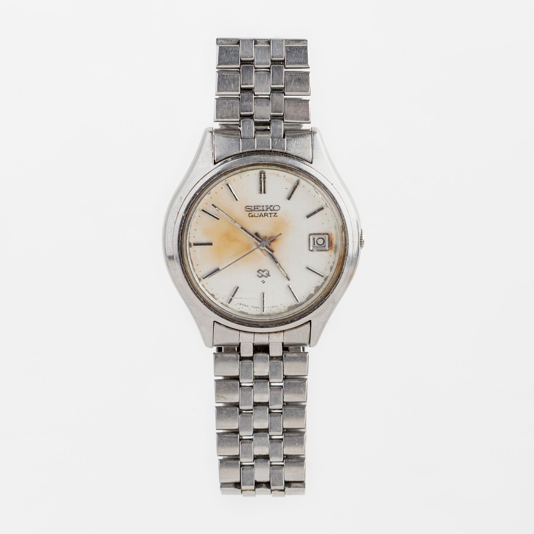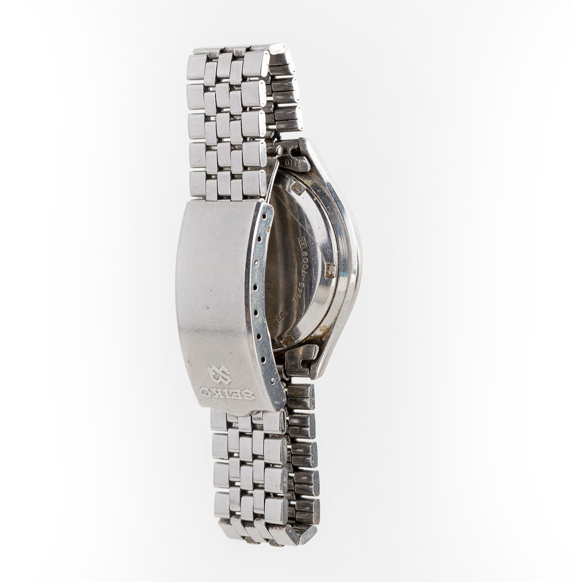 Reloj pulsera para hombre marca Seiko, a cuarzo. Esfera plateada con calendario, manchada. Caja y malla en acero inoxidable. Funcionando. Esfera con manchas.